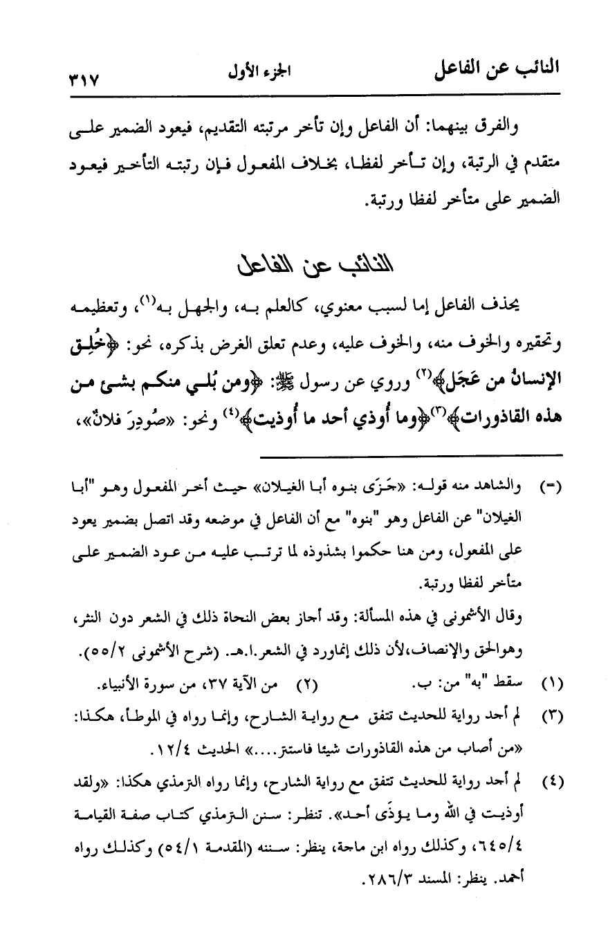 يحذف الفاعل إما لسبب معنوي، كالعلم به، والجهل به، وتعظيمه وتحقيره والخوف منهن والخوف عليه، وعدم تعلق الغرض بذكره، نحو {خُلِقَ الْإِنسَانُ مِنْ عَجَلٍ} [الأنبياء:37] وروي عن رسول الله صلى الله عليه وسلم: (ومن بُلي منكم بشيء من هذه القاذورات) (وما أُوذي أحد ما أُذيت) ونحو:" صُودِرَ فلانٌ "،