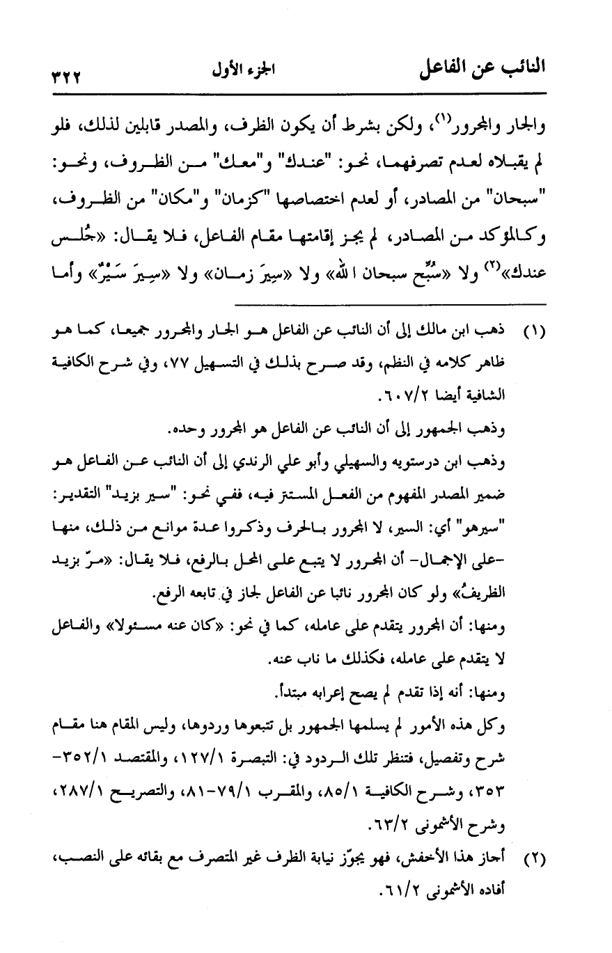 والجار والمجرور، ولكن بشرط أن يكون الظرف، والمصدر قابلين لذلك، فلو لم يقبلاه لعدم تصرفهما، نحو: "عندك" و "معك" من المظروف، ونحو: "سبحان" من المصادر، أو لعدم اختصاصها "كزمان" و "مكان" من الظروف، وكالمؤكد من المصادر، لم يجز إقامتها مقام الفاعل، فلا يقال:" جُلس عندك "ولا" سُبِّح سبحان الله "ولا" سِير زمان "ولا" سِير سَيرٌ "وأما