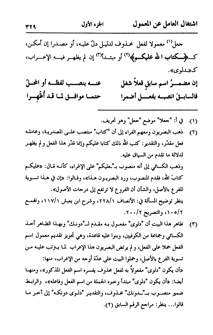 جعل معمولا لفعل محذوف لدليل دل عليهن أو مصدرا إن أمكن، ك {كِتَابَ اللَّهِ عَلَيْكُمْ} [النساء:24] أو مبتدأ إن لم يظهر فيه الأعراب، ك" دلوي ".