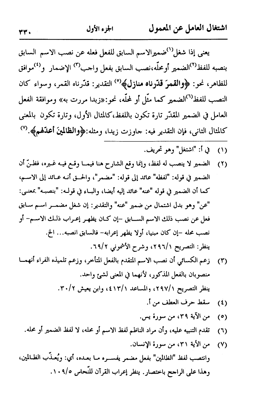 يعني إذا شغل ضمير الاسم السابق للفعل فعله عن نصب الاسم السابق بنصبة للفظ الضمير أو محله، نصب السابق بفعل واجب الإضمار وموافق للظاهر، نحو: {وَالْقَمَرَ قَدَّرْنَاهُ مَنَازِلَ} [يس:39] التقدير: قدّرناه القمر، وسواء كان النصب للفظ الضمير كما مثل أو لمحله، نحو:" زيدا مررت به "وموافقة الفعل العامل في الضمير المقدر تارة تكون باللفظ، كالمثال الأول، وتارة تكون بالمعنى كالمثال الثاني، فغن التقدير فيه: جاوزت زيدا، ومثله: {وَالظَّالِمِينَ أَعَدَّ لَهُمْ}.