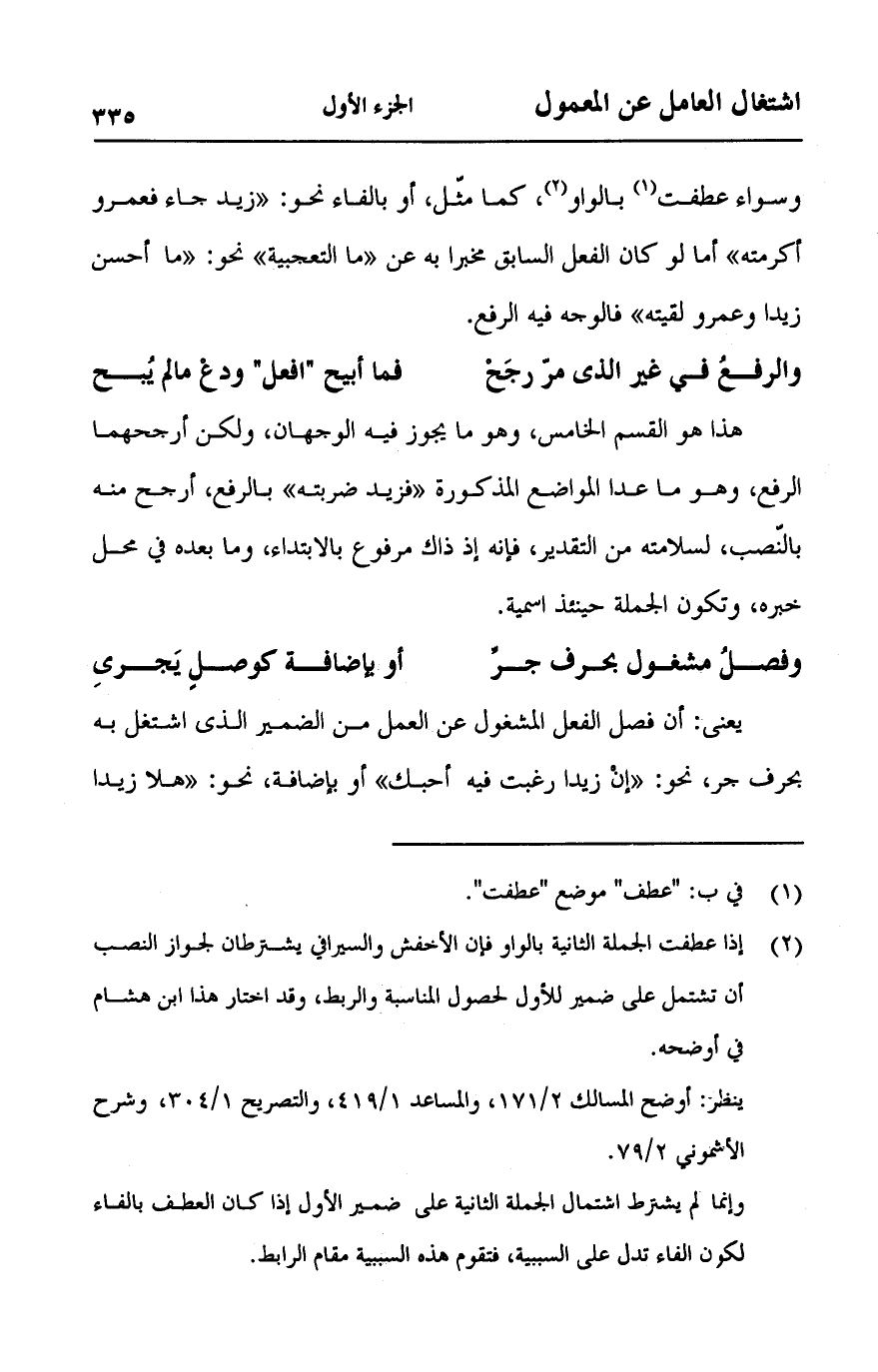 يعني: أن فصل الفعل المشغول عن العمل من الضمير الذي اشتغل به بحرف جر، نحو:" إنْ زيدا رغبت فيه أحبك "أو بإضافة، نحو:" هلا زيدا