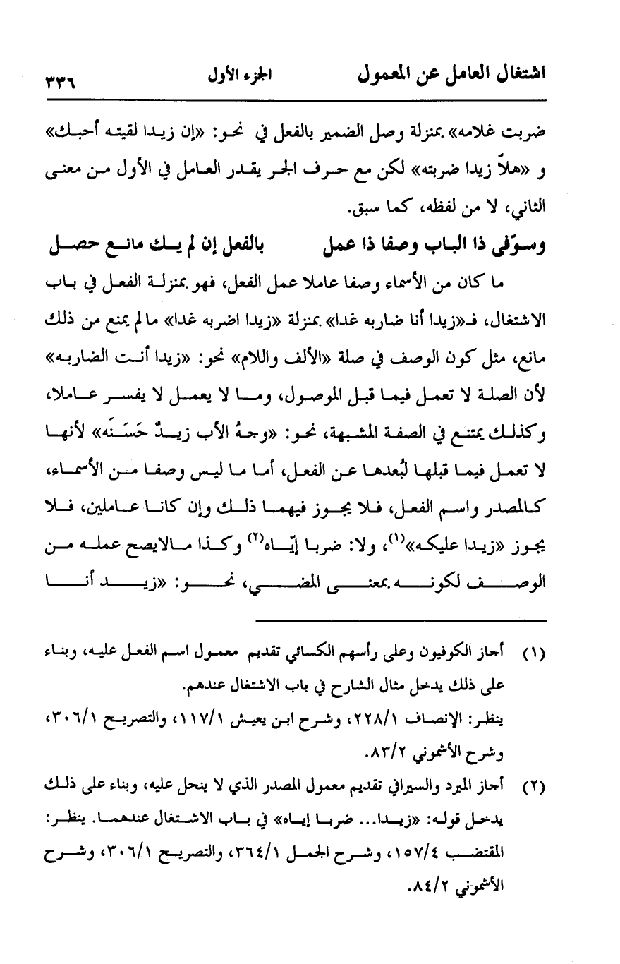 ما كان من الأسماء وصفا عاملا عمل الفعل، فهو بمنزلة الفعل في باب الاشتغال، ف" زيدا أنا ضاربه "غدا بمنزلة" زيدا اضربه غدا "مالم يمنع من ذلك مانع، مثل كون الوصف في صلة" الألف واللام "نحو:" زيداً أنت الضاربة "لأن الصلة لا تعمل فيما قبل الموصول، وما لا يعمل لا يفسر عاملا، وكذلك يمتنع في الصفة المشبهة، نحو: وجه الأب زيد حَسَنهَ لأنها لا تعمل فيما قبلها لبٌعدها عن الفعل، أما ما ليس وصفا من الأسماء، كالمصدر واسم الفعل، فلا يجوز فيهما ذلك وإن كان عاملين، فلا يجوز" زيدا عليكه "، ولا: ضربا إياه وكذا ما لا يصح عمله من الوصف لكونه بمعنى المضي، نحو:" زيد أنا