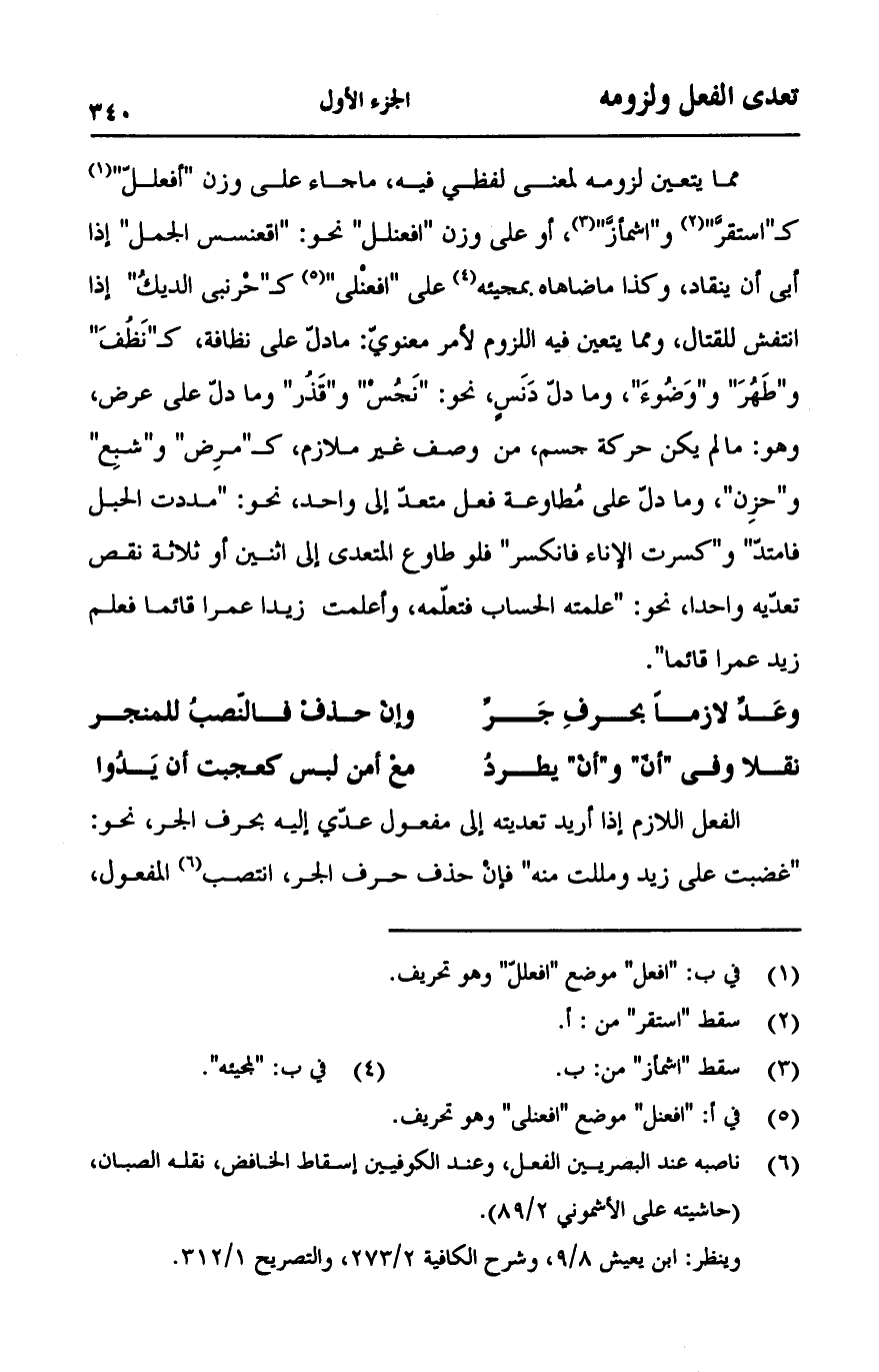 مما يتعين لزومه لمعنى لفظي فيه، ما جاء على وزن "افعلل" ك "استقرَّ" و "اشمازَّ، أو على وزن "افعنلل" نحو: "اقعنسس الجمل" إذا أبى أن ينقاد، وكذا ماضاهاه بمجيئه على افعنْلى" ك "حْرنبى الديكُ" إذا انتفش للقتال، ومما يتعين فيه اللزوم لأمر معنويّ: ما دلّ على نظافة، ك "نَظُفَ" و "طَهُرَ" و "وَضُوءَ"، وما دلّ دَنَسٍ، نحو: "نَجُسْ" و "قَذُر" وما دل على عرض، وهو: مالم يكن حركة جسم، من وصف غير ملازم، ك "مرِض" و "شبِع" و "حزِن"، وما دلّ على مُطاوعة فعل متعدّ إلى واحد، نحو: "مددت الحبل فامتد" و"كسرت الإناء فانكسر" فلو طاوع المتعدي إلى اثنين أو ثلاثة نقص تعدّيه واحدا، نحو: "علمت الحساب فتعلمه، وأعلمت زيداً عمرا قائما فعلم زيد عمرا قائماً.