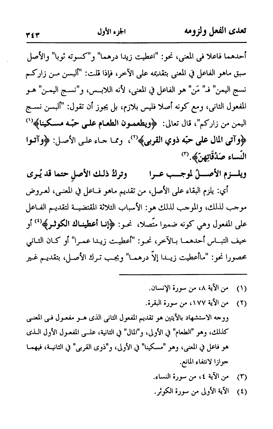 أحدهما فاعلا في المعنى، نحو: "أعطيت زبداً درهماً" و "كسوته ثوباً" والأصل سبق ما هو الفاعل في المعنى بتقديمه على الآخر، فإذا قلت: "ألبسن من زاركم نسج اليمن" ف "مَن" هو الفاعل في المعنى، لأنه اللابس، و"نسج اليمن" هو المفعول الثاني، ومع كونه أصلا فليس بلازم، بل يجوز أن تقول: "ألبسن نسج اليمن من زاركم"، قال تعالى: {وَيُطْعِمُونَ الطَّعَامَ عَلَى حُبِّهِ مِسْكِينًا} [الإنسان:8] {وَآتَى الْمَالَ عَلَى حُبِّهِ ذَوِي الْقُرْبَى} [البقرة:177]، ومما جاء على الأصل: {وَآتُوا النَّسَاء صَدُقَاتِهِنَّ} [النساء:4].