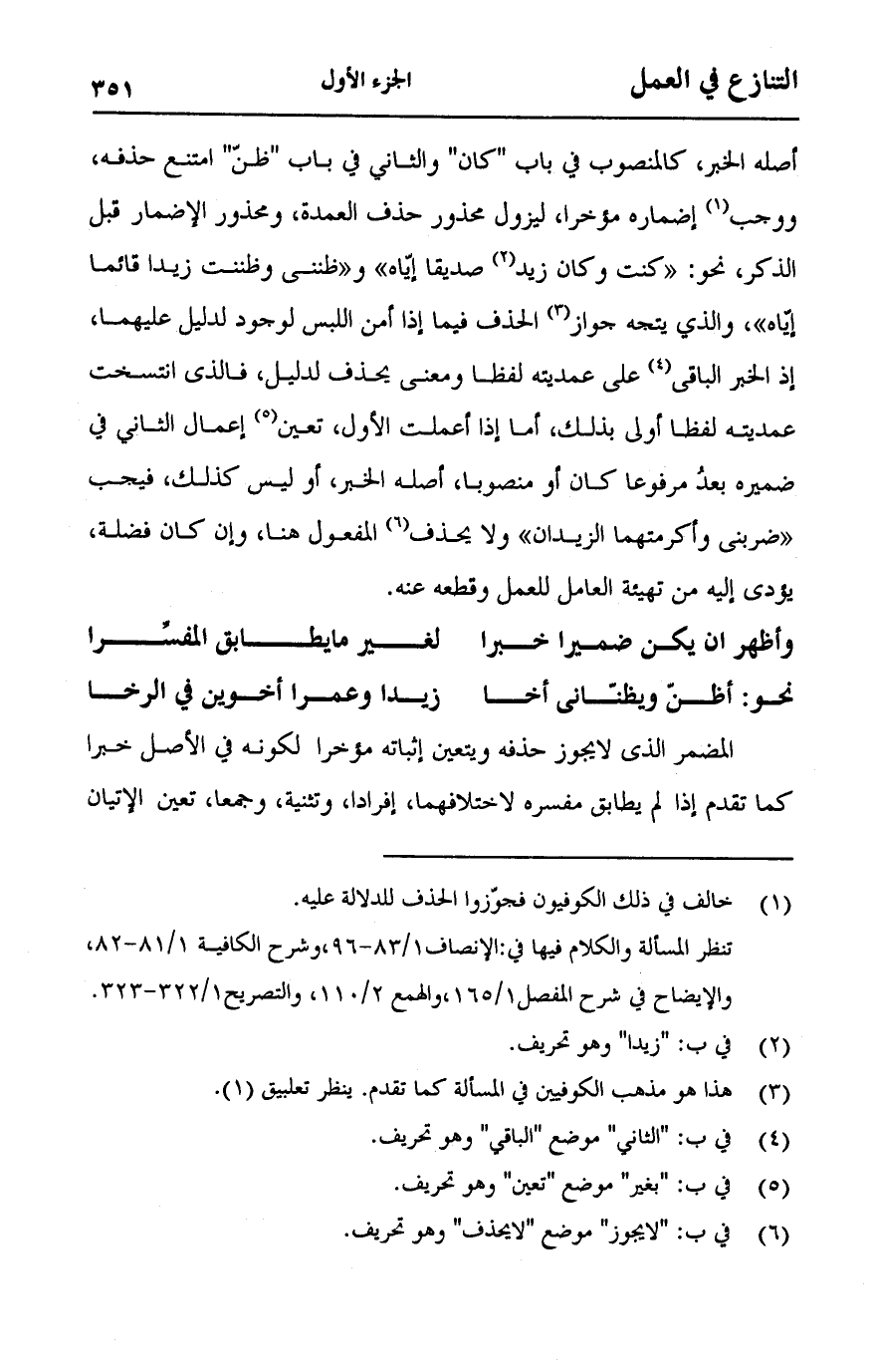أصله الخبر، كالمنصوب في باب "كان" والثاني في باب "ظن" امتنع حذفه، ووجب إضماره مؤخرا، ليزول محذور حذف العمدة، ومحذور الإضمار قبل الذكر، نحو:" كنت وكان زيد صديقا إياه "و" ظنني وظننت زيدا قائما إياه "، والذي يتجه جواز الحذف فيما إذا أمن اللبس لوجود الدليل عليهما، إذ الخبر الباقي على عمديته لفظا ومعنى يحذف لديل، فالذي انتسخت عمديته لفظا أولى بذلك، أما إذا أعلمت الأول، تعين إعمال الثاني في ضميره يعدّ مرفوعا كان أو منصوبا، أصله الخبر، أو ليس كذلك، فيجب" ضربني وأكرمتهما الزيدان "ولا يحذف المفعول هنا، وإن كان فضلة، يؤدي إليه من تهيئة العامل للعمل وقطعه عنه.