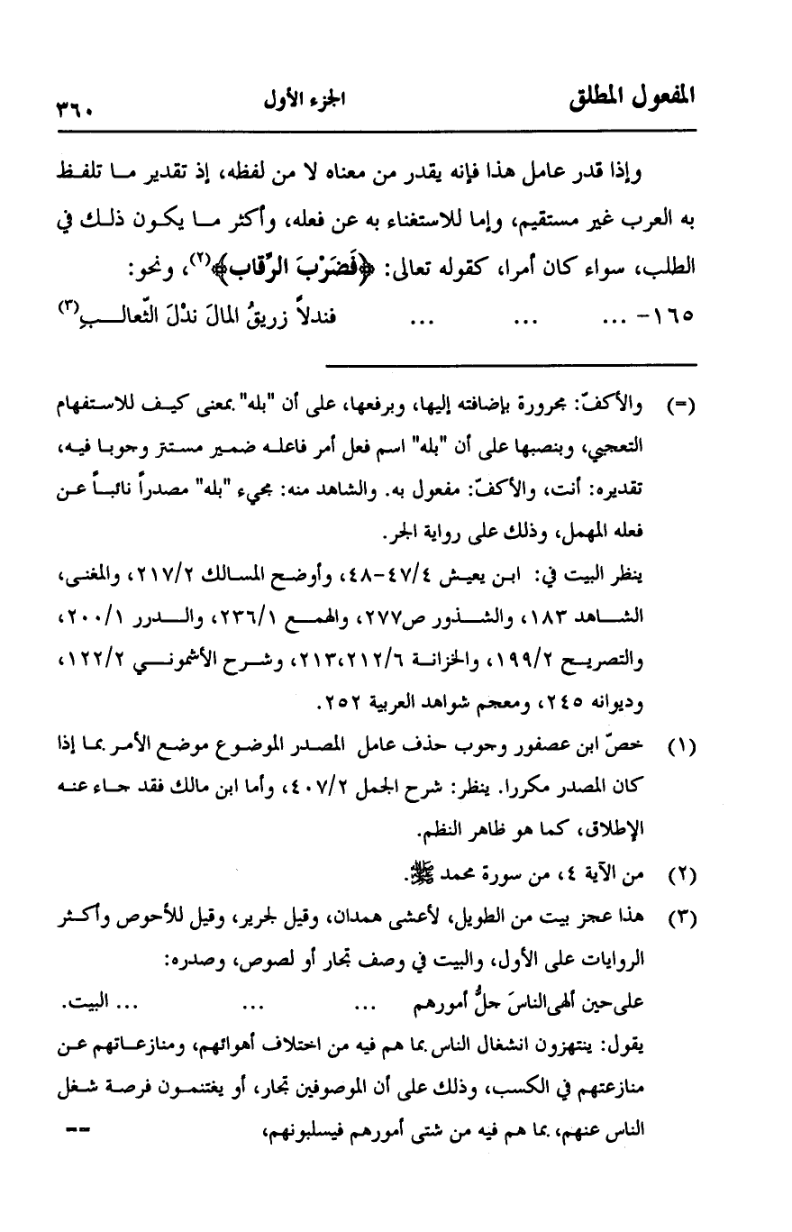 وإذا قدر عامل هذا فإنه يقدر من معناه لا من لفظه، إذ تقدير ما تلفظ به العرب غير مستقيم، وإما للاستغناء به عن فعله، وأكثر ما يكون ذلك في الطلب، سواء كان أمرا، كقوله تعالى: {فَضَرْبَ الرِّقاب} [محمد:4]، ونحو:
