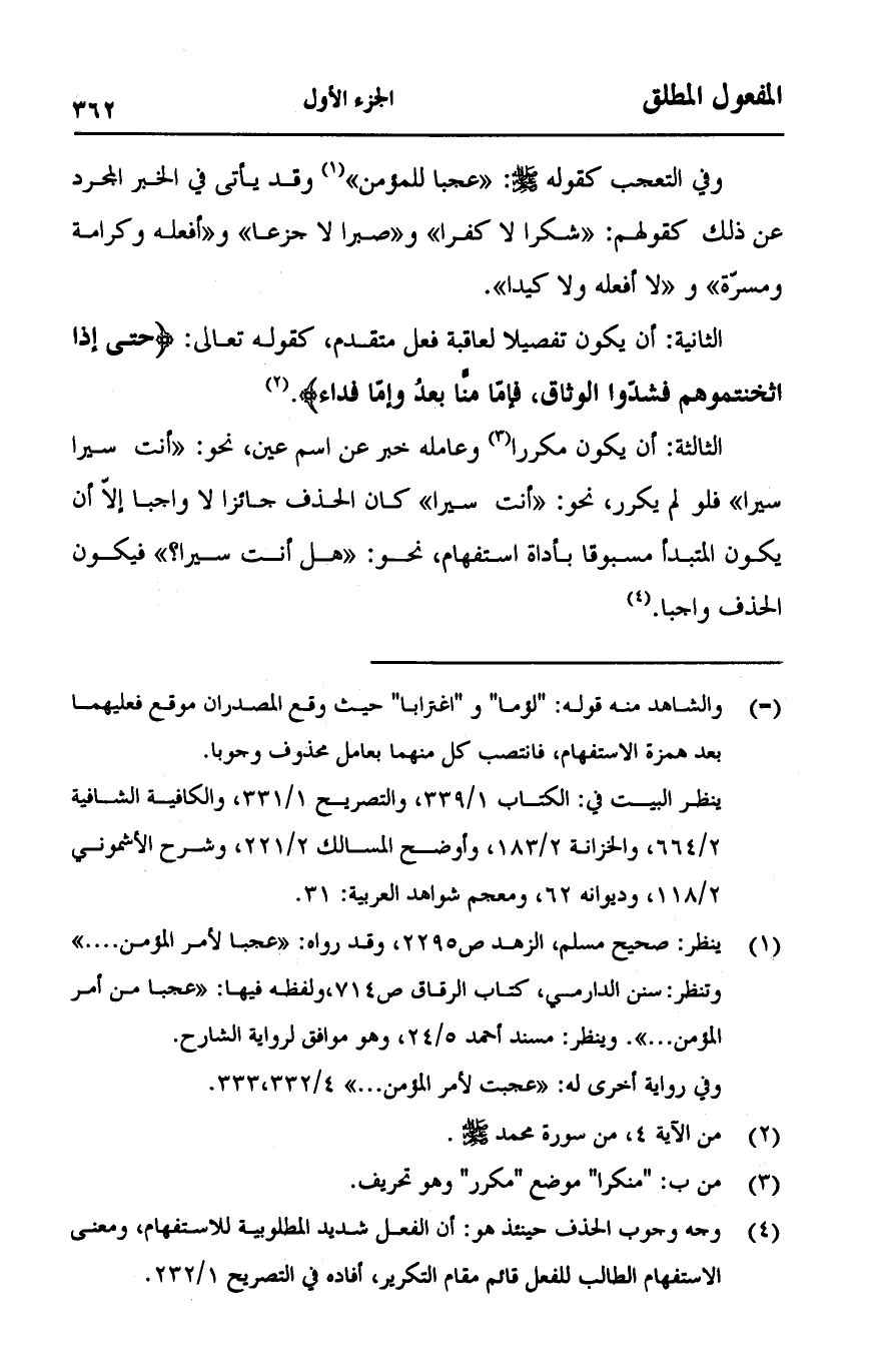 وفي التعجب كقوله صلى الله عليه وسلم:" عجبا للمؤمن وقد يأتي في الخبر المجرد عن ذلك كقولهم:" شكرا لا كفرا "و" صبرا لا جزعا "و" أفعله وكرامة ومسرة "و" لا أفعله ولا كيدا ".