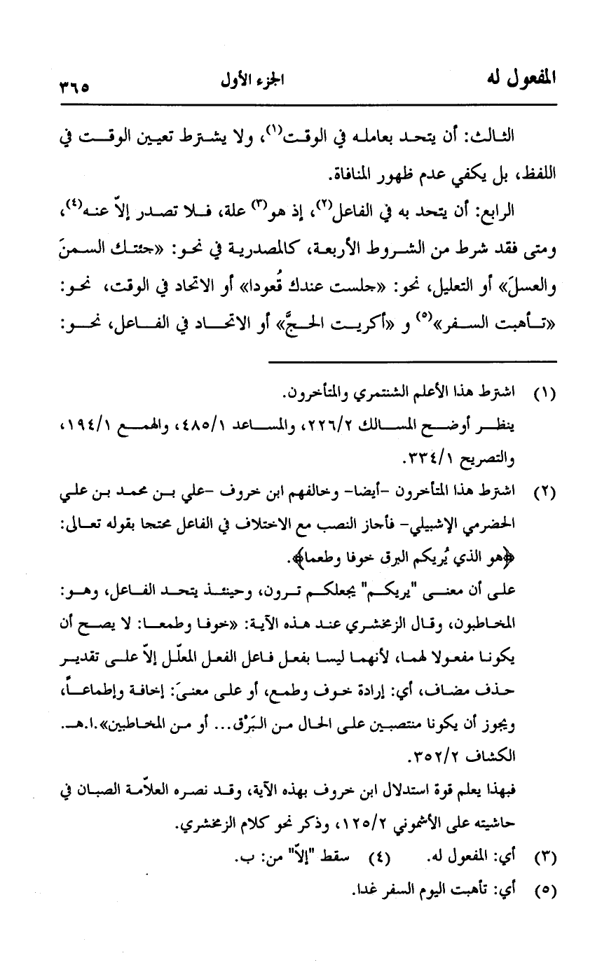 الرابع: أن يتحد به في الفاعل، إذ هو علة، فلا تصدر إلا عنه، ومتى فقد شرط من الشروط الأربعة، كالمصدرية في نحو:" جئتك السمنَ والعسلَ "أو التعليل، نحو:" جلست عندك قُعودا "أو الاتحاد في الوقت، نحو:" تأهبت السفر "و" أكريت الحجَّ "أو الاتحاد في الفاعل، نحو:
