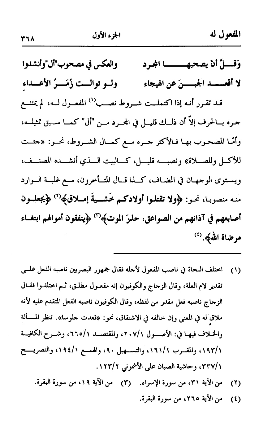 قد تقرر أنه إذا اكتملت شروط نصب المفعول له، لم يمتنع جره بالحرف إلاّ أن ذلك قليل في المجرد من "أل" كما سبق تمثيله، وأمّا المصحوب بها فلأكثر جره مع كمال الشروط، نحو:" جئت للأكل والصلاة "ونصبه قليل، كالبيت الذي أنشده المصنف، ويستوي الوجهان في المضاف، كذا قال المتأخرون، مع غلبة الوارد منه منصوبا، نحو: {وَلاَ تَقْتُلُوا أَوْلادَكُمْ خَشْيَةَ إِمْلاقٍ} [الإسراء:31] {يَجْعَلُونَ أَصَابِعَهُمْ فِي آذَانِهِم مِّنَ الصَّوَاعِقِ حَذَرَ الْمَوْتِ} [البقرة:19] {يُنْفِقُونَ أَمْوَالَهُمُ ابْتِغَاءَ مَرْضَاةِ اللَّهِ}