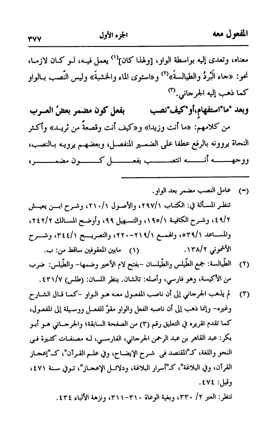 معناه، وتعدى إليه بواسطة الواو، [ولهذا كان] يعمل فيه، لو كان لازما، نحو: "جاء الَبْردُ والطيالسةَ" و "استوى الماء والخشبةَ" وليس النّصب بالواو كما ذهب إليه الجرجاني.