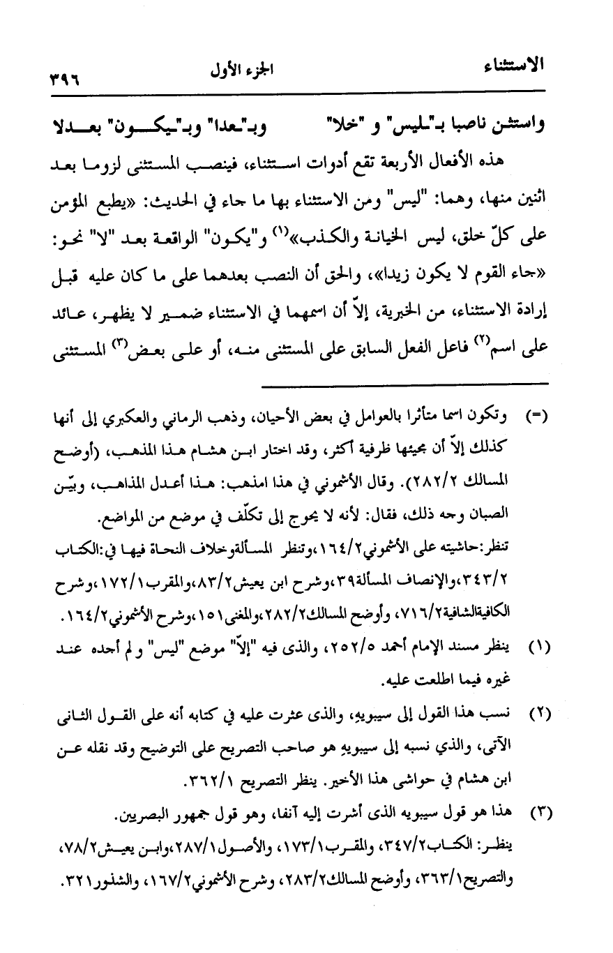 (واستثن ناصبا بـ"ـليس" و"خلا" ... وبـ"ـعدا" وبـ"ـيكون" بعدلا