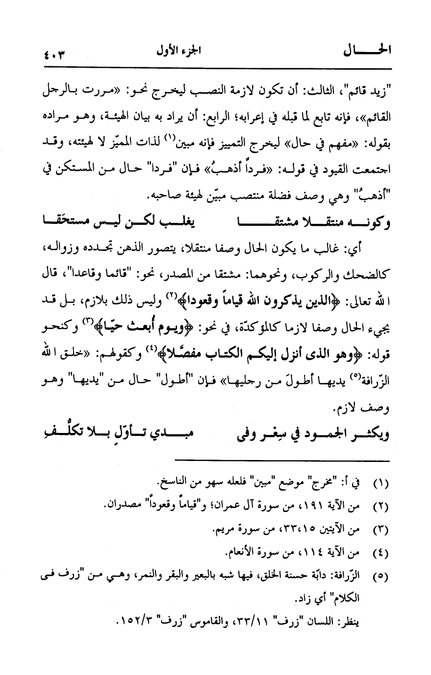 "زيد قائم"، الثالث: أن تكون لازمة النصب ليخرج نحو: "مررت بالرجل القائم"، فإنه تابع لما قبله في إرعابه؛ الرابع: أن يراد به بيان الهيئة، وهو مراد بقوله: "مفهم في حال" ليخرج التمييز فإنه مبين لذات المميّز لا لهيئته، وقد اجتمعت القيود في قوله: "فرداً أذهبُ" فإن "فردا" حال من المستكن في "اذهب" وهي وصف فضلة منتصب مبيّن لهيئة صاحبه.