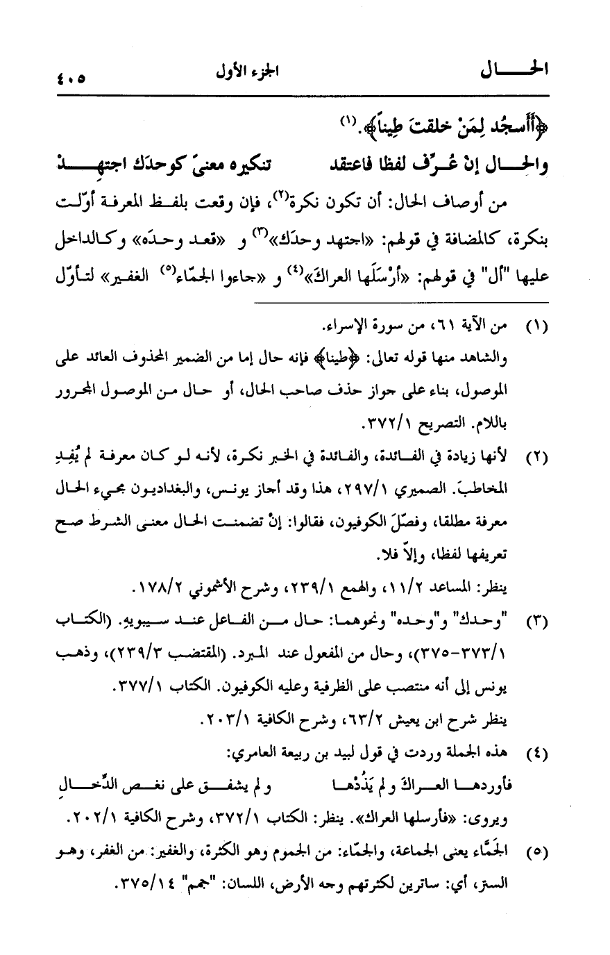 من أوصاف الحال: أن تكون نكرة، فإن وقعت بلفظ المعرف أوّلت بنكرة، كالمضافة في قولهم: "اجتهد وحدّك" و "قعد وحده" وكالداخل عليها "أل" في قولهم: "أرْسَلَها العراكَ" و "جاءوا الجمّاء الغفير" لتأوّل