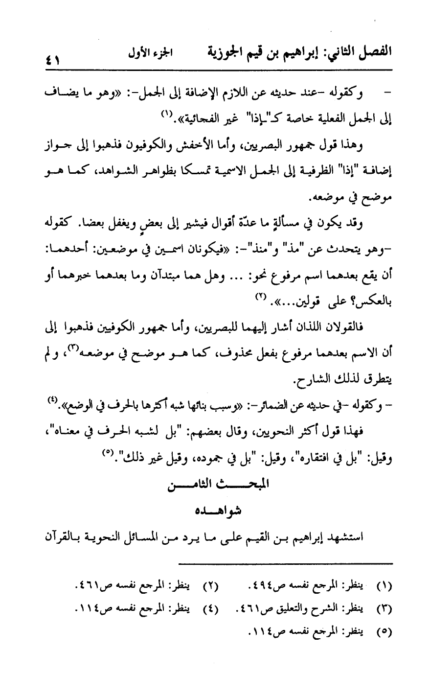 استشهد إبراهيم بن القيم على ما يرد من المسائل النحوية بالقرآن
