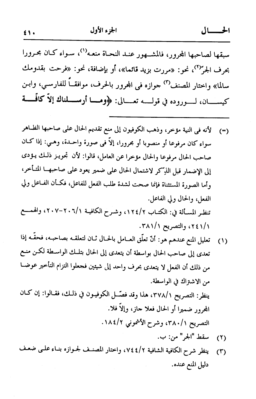 سبقها لصاحبها المجرور، فالمشهور عند النحاة منعه، سواء كان مجرورا بحرف الجر، نحو: "مررت بزيد قائما"، أو بإضافة، نحو: "فرحت بقدومك سالما" واختار المصنف جوازه في المجرور بالحرف، موافقاً للفارسي، وابن كيسان، لوروده في قوله تعالى: {وَمَا أَرْسَلْنَاكَ إِلَّا كَافَّةً