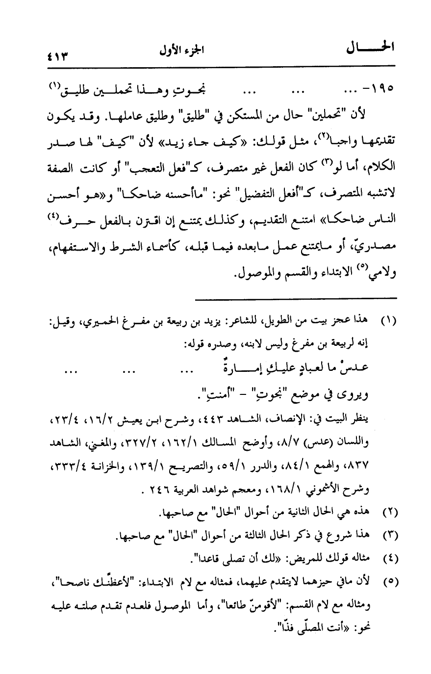 لأن "تحملين" حال من المستكن في "طليق" وطليق عاملها. وقد يكون تقديمها واجبا، مثل قولك: "كيف جاء زيد" لأن "كيف" لها صدر الكلام، أما لو كان الفعل غير متصرف، كـ"فعل التعجب" أو كانت الصفة لا تشبه المتصرف، كـ"أفعل التفضيل" نحو: "ما أحسنه ضاحكا" و "هو أحسن الناس ضاحكا" امتنع التقديم، وكذلك يمتنع إن اقترن بالفعل حرف مصدري، أو ما يمتنع عمل ما بعده فيما قبله، كأسماء الشرط والاستفهام، ولامي الابتداء والقسم والموصول.