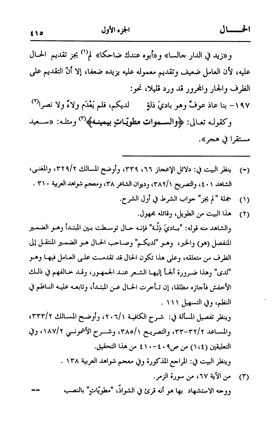 و "زيد في الدار جالسا" و "أبوه عندك ضاحكا" لم يجز تقديم الحال عليه، لأن العامل ضعيف وتقديم معموله عليه يزيده ضعفا، إلا أن التقديم على الظرف والجار والمجرور قد ورد قليلا، نحو: