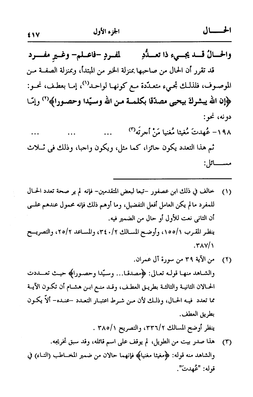 قد تقرر أن الحال من صاحبها بمنزلة الخبر من المبتدأ، وبمنزلة الصفة من الموصوف، فلذلك تجيء متعدّدة مع كونها لواحد، إما بعطف، نحو: {الْمِحْرَابِ أَنَّ اللَّهَ يُبَشِّرُكَ بِيَحْيَى مُصَدِّقًا بِكَلِمَةٍ مِنَ اللَّهِ وَسَيِّدًا وَحَصُورًا} [آل عمران: 39] وإمّا دونه، نحو: