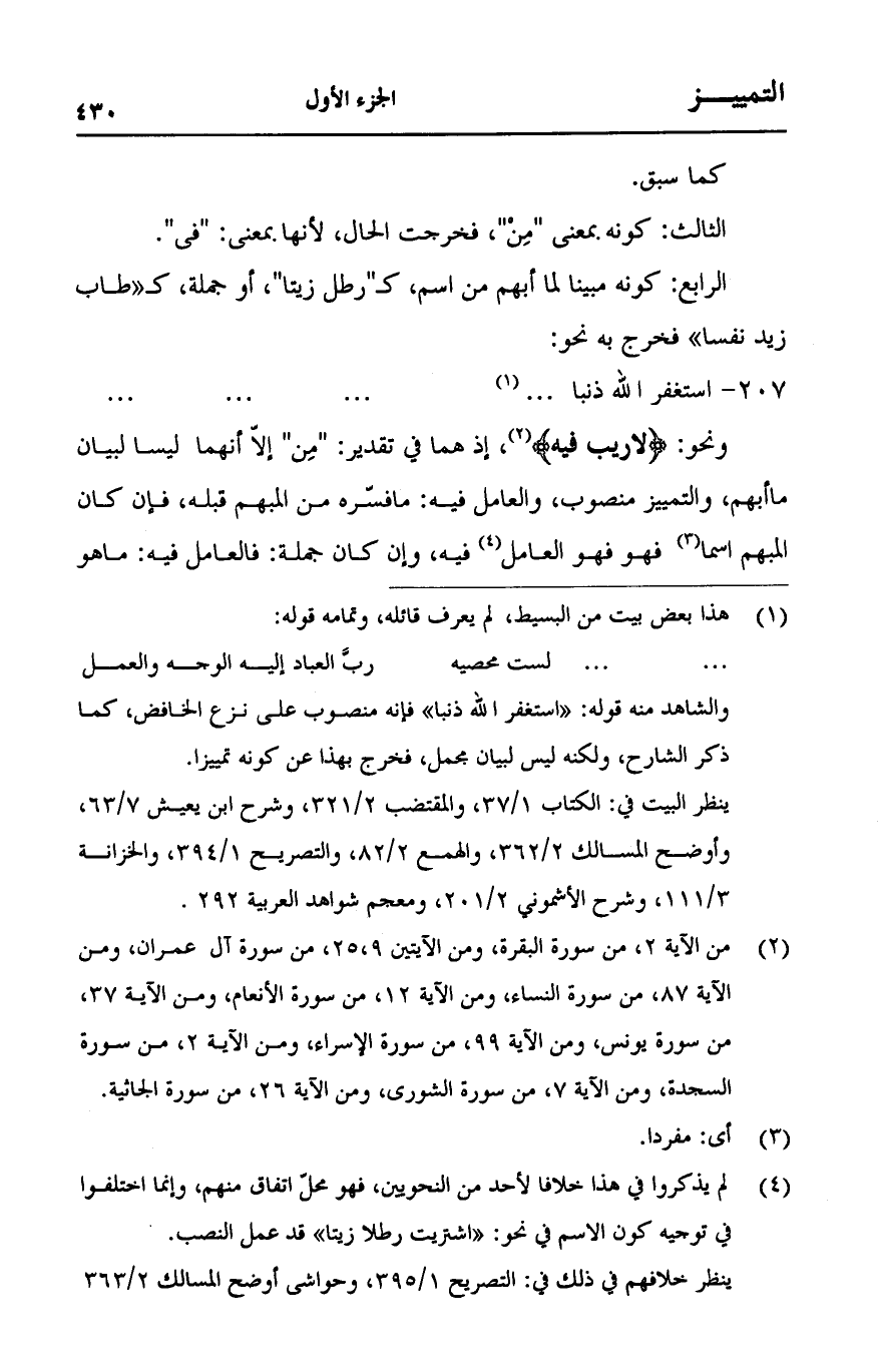 ونحو: {لَا رَيْبَ فِيهِ} [البقرة: 2]، إذ هما في تقدير: "مِن" إلا أنهما ليسا لبيان ما أبهم، والتمييز منصوب، والعامل فيه: ما فسّره من المبهم قبله، فإن كان المبهم اسما فهو العامل فيه، وإن كان جملة: فالعامل فيه: ما هو