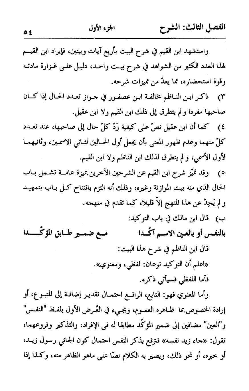 5) وقد تميز شرح ابن القيم عن الشرحين الآخرين بميزة عامة تشمل باب الحال الذي منه بيت الموازنة وغيره، وذلك أنه التزم بافتتاح كل باب بتمهيد ولم يحد عم هذا المنهج إلا قليلاً، كما تقدم في منهجه.