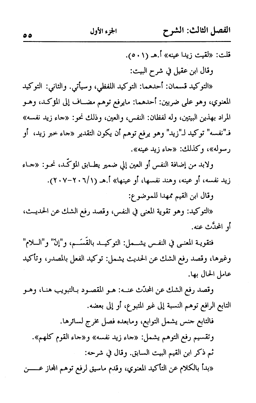 والثاني التوكيد المعنوي، وهو على ضربين: أحدهما: ما يرفع توهم مضاف إلى المؤكد، وهو المراد بهذين البيتين، وله لفظان: النفس، والعين، وذلك نحو: "جاء زيد نفسه" ف"نفسه" توكيد ل "زيد" وهو يرفع توهم أن يكون التقدير "جاء خبر زيد، أو رسوله"، وكذلك: "جاء زيد عينه".
