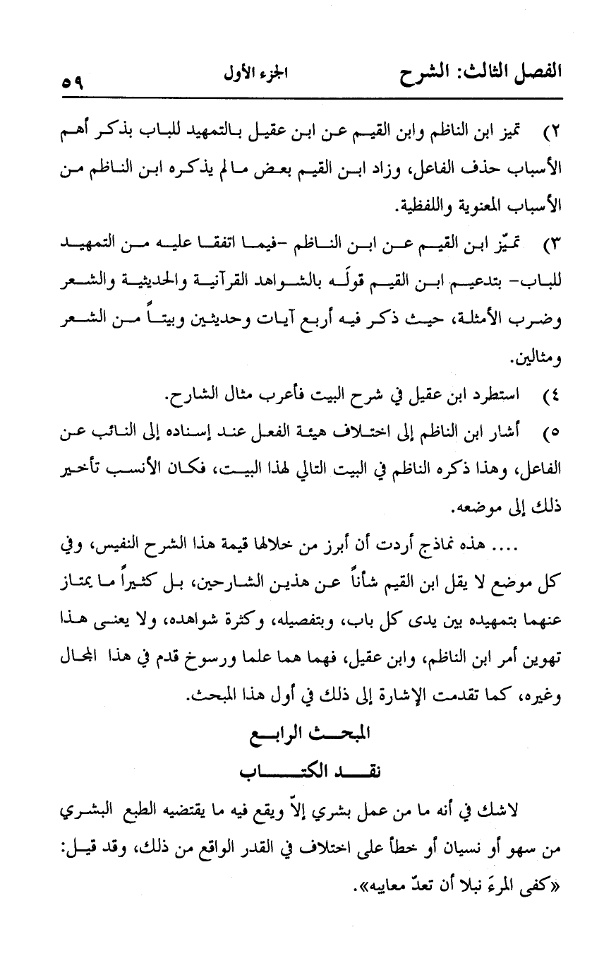 .هذه نماذج أردت أن أبرز من خلالها قيمة هذا الشرح النفيس، وفي كل موضع لا يقل أبن القيم شأناً عن هذين الشارحين، بل كثيراً ما يمتاز عنهما بتمهيده بين يدى كل باب وبتفصيله، وكثرة شواهده، ولا يعني هذا تهوين أمر ابن الناظم، وابن عقيل، فهما هما علما ورسوخ قدم في هذا المجال وغيره، كما تقدمت الإشارة إلى ذلك في أول هذا المبحث.