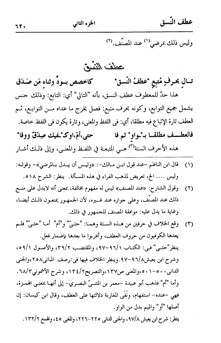 (فالعطف مطلقا بـ "ـواو" ثم فا ... حتى, أم , أو كـ "ـفيك صدق ووفا")