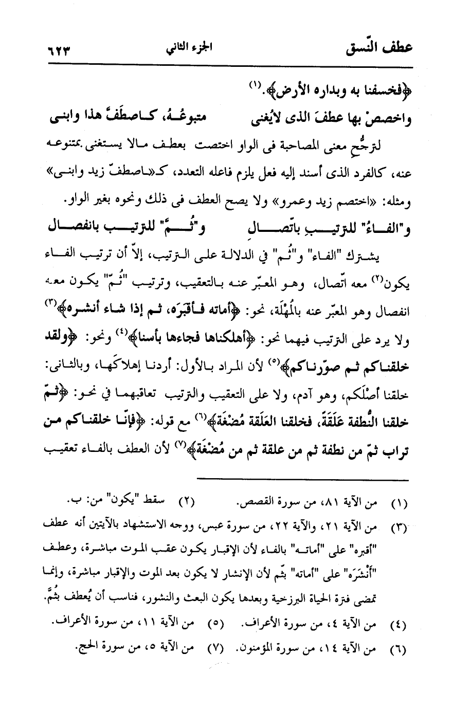 تُرَابٍ ثُمَّ مِن نُّطْفَةٍ ثُمَّ مِنْ عَلَقَةٍ ثُمَّ مِن مُّضْغَةٍ} [الحج: 5] لأن العطف بالفاء تعقيب