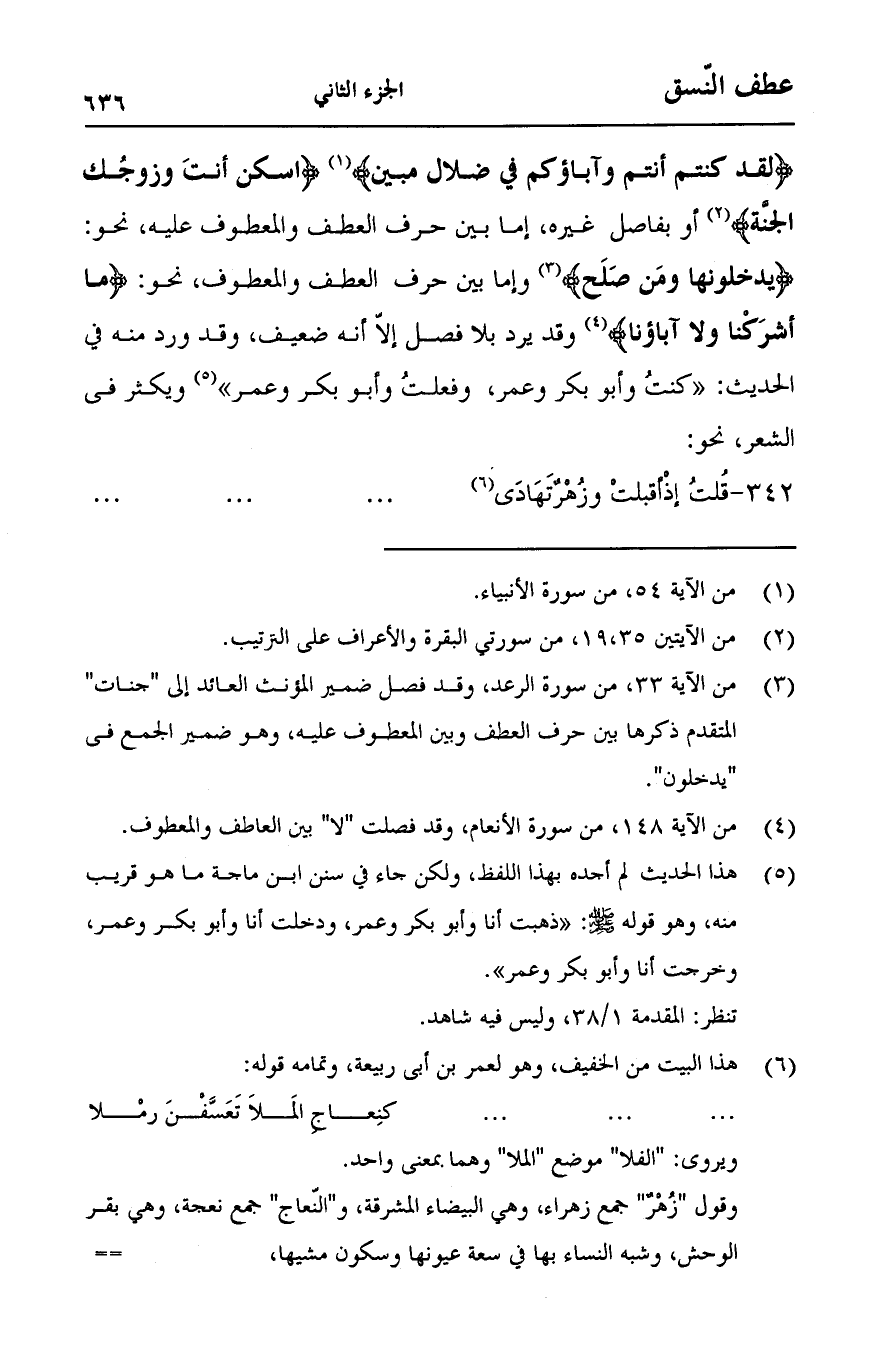 {لَقَدْ كُنْتُمْ أَنْتُمْ وَآَبَاؤُكُمْ فِي ضَلَالٍ مُبِينٍ} [سورة الأنبياء:54]، {اسْكُنْ أَنْتَ وَزَوْجُكَ الْجَنَّةَ} [البقرة: 35]، أو بفاصل غيره، إما بين حرف العطف والمعطوف عليه، نحو: {يَدْخُلُونَهَا وَمَنْ صَلَحَ} [سورة الرعد: 33]، وإما بين حرف العطف والمعطوف، نحو: {مَا أَشْرَكْنَا وَلَا آَبَاؤُنَا} [سورة الأنعام: 148] وقد يرد بلا فصل إلا أنه ضعيف، وقد ورد منه في الحديث:" كنت وأبو بكر، وعمر، وفعلت وأبو بكر وعمر، ويكثر في الشعر "، نحو: