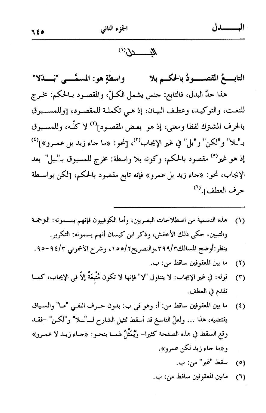 هذا حد البدل، فالتابع: جنس يشمل الكل، والمقصود بالحكم: مخرج للنعت، والتوكيد، وعطف البيان، إذ هي تكملة للمقصود، [وللمسبوق بالحرف المشترك لفظا ومعنة، إذ هو بعض المقصود] ولا كله، وللمسبوق "بلا" و"لكن" و"بل" في غير الإيجاب، [نحو:" ما جاء زيد بل عمرو "إذ هو غير مقصود بالحكم، وكونه بلا واسطة: مخرج للمسبوق "بل" بعد الإيجاب، نحو: "جاء زيد بل عمرو" فإنه تابع مقصود بالحكم، [لكن بواسطة حرف العطف].