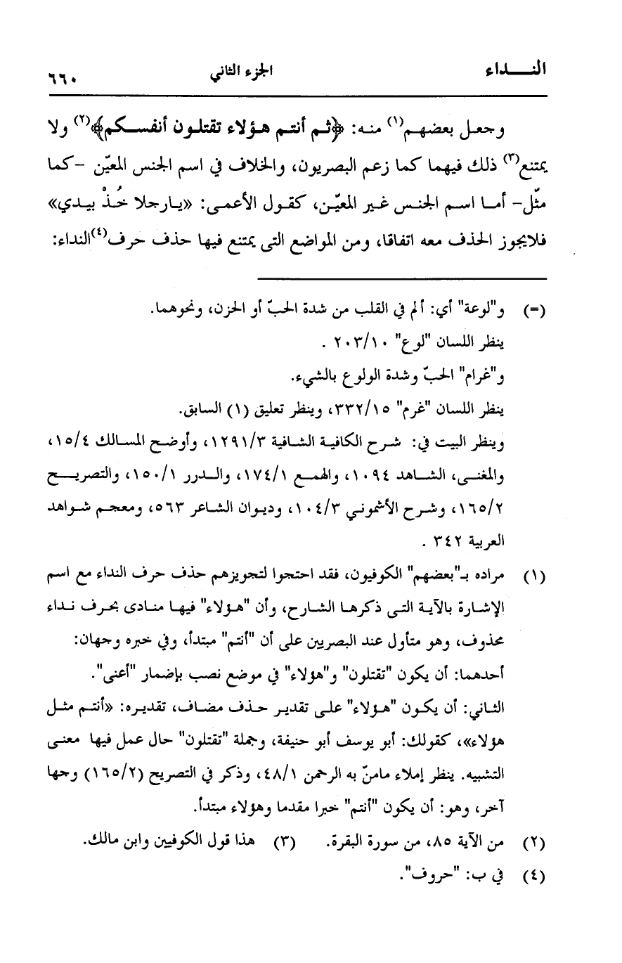 وجعل بعضهم منه: {ثُمَّ أَنْتُمْ هَؤُلَاءِ تَقْتُلُونَ أَنْفُسَكُمْ} [سورة البقرة: 85] ولا يمتنع ذلك فيهما كما زعم البصريون، والخلاف في اسم الجنس المعين- كما مثل- أما اسم الجنس غير المعين، كقول الأعمى:" يا رجلا خذ بيدي "فلا يجوز الحذف معه اتفاقا، ومن المواضع التي يمتنع فيها حذف حرف النداء: