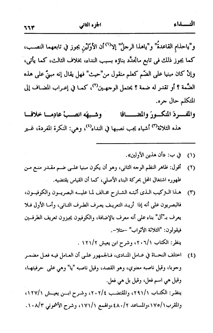 و"يا حذام القاعدة و"يا هذا الرجل" إلا أن الأولين يجوز في تابعها النصب، كما يجوز ذلك في تابع ما تجدد بناؤه بسبب النداء، بخلاف الثالث، كما يأتي وإن كان مبينا على الضم كعلم منقول من "حيث" فهل يقال إنه مبنى على هذه الضمة؟ أو تقدر له ضمة؟ يحتمل الوجيهن، كما في إعراب المضاف إلى المتكلم حال جره.