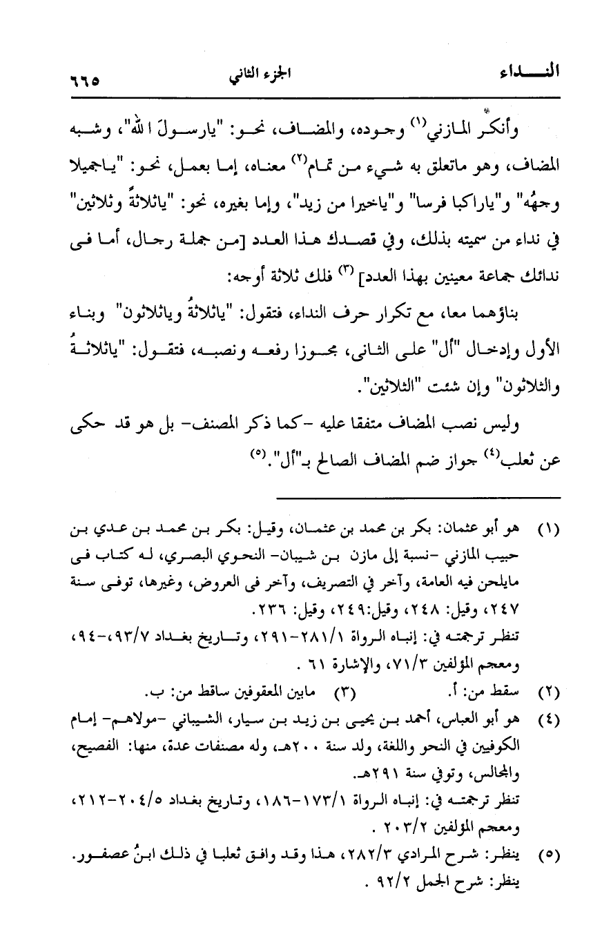 وأنكر المازني وجوده، والمضاف، نحو: "يا رسول الله"، وشبه المضاف، وهو ما تعلق به شيء من تمام معناه، إما بعمل، نحو: "يا جميلا وجهه" و"يا راكبا فرسا" و"يا خيرا من زيد" وإما بغيره، نحو: "يا ثلاثة وثلاثين" في نداء من سميته بذلك، وفي قصدك هذا العدد [من جملة رجال، أما في ندائك جماعة معينين بهذا العدد] فلك ثلاثة أوجه: