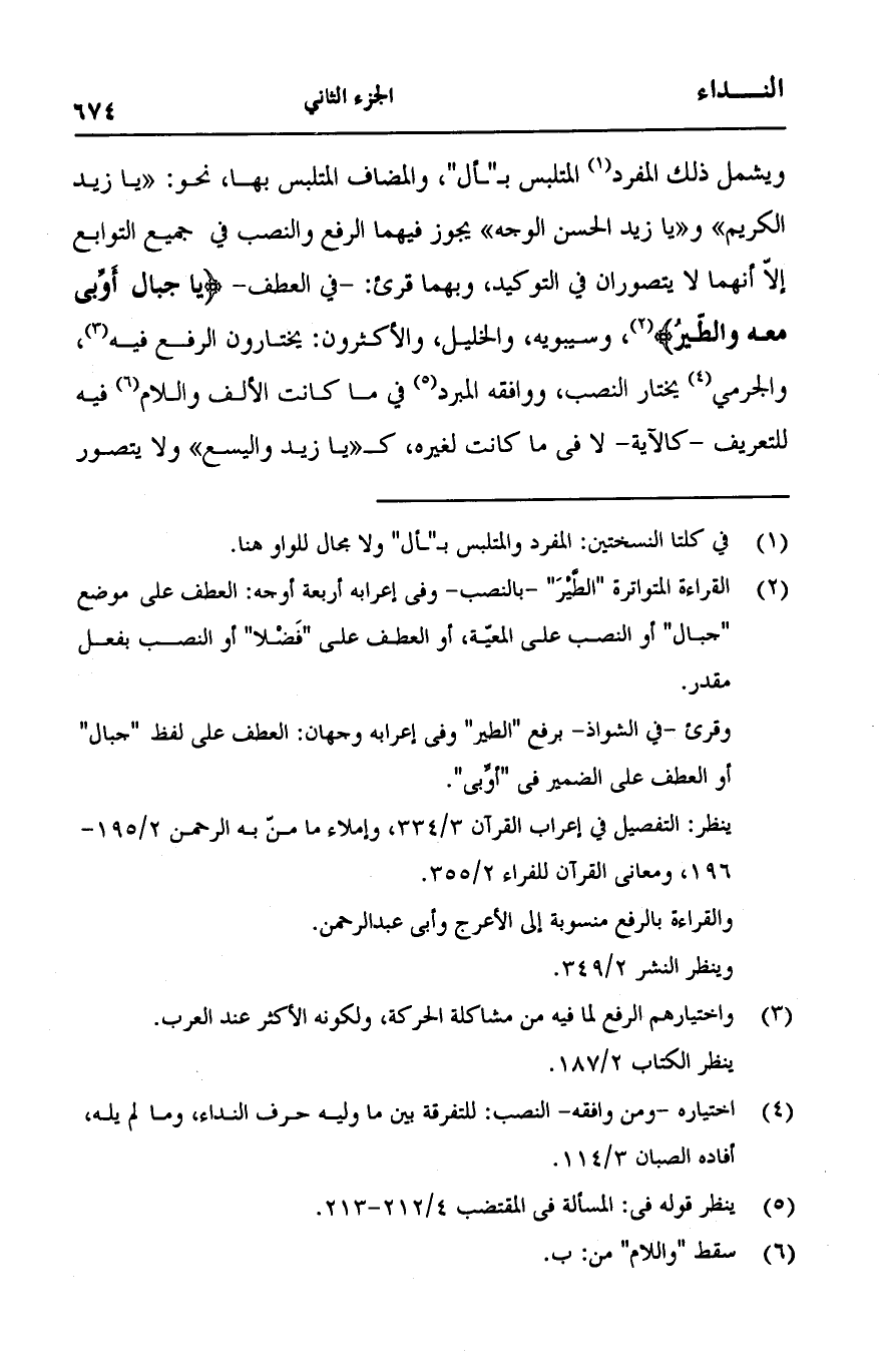 ويشمل ذلك المفرد المتلبس "بأل" والمضاف المتلبس بها، نحو:" يا زيد الكريم "و" يا زيد الحسن الوجه "يجوز فيها الرفع والنصب في جميع التوابع إلا أنهما لا يتصوران في التوكيد، وبهما قرئ:- في العطف- {يَا جِبَالُ أَوِّبِي مَعَهُ وَالطَّيْرَ} [] وسيبويه، والخليل، والأكثرون: يختارون الرفع فيه، والجرمي يختار النصب، ووافقه المبرد في ما كانت الألف واللام فيه للتعريف- كالآية- لا في ما كانت لغيره، كـ" يا زيد واليسع "ولا يتصور