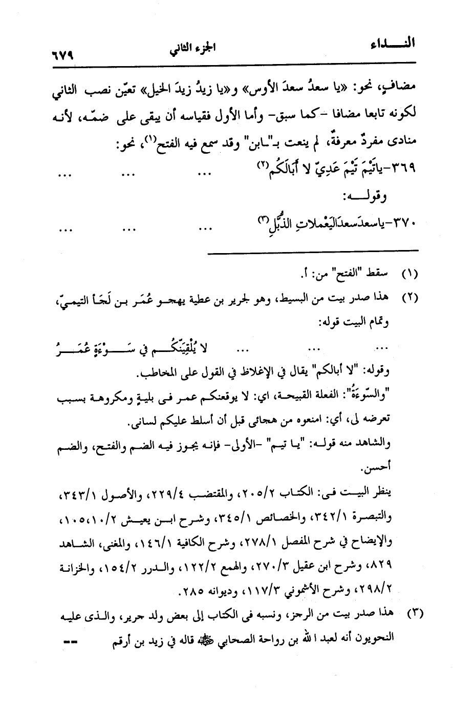 مضاف، نحو:" يا سعد سعد الأوس "و" يا زيد ويد الخيل "تعين نصب الثاني لكونه تابعا مضافا- كما سبق- وأما الأول فقياسة أن يبقى على ضمه، لأنه منادى مفرد معرفة، لم ينعت "بابن" وقد سمع فيه الفتح نحو: