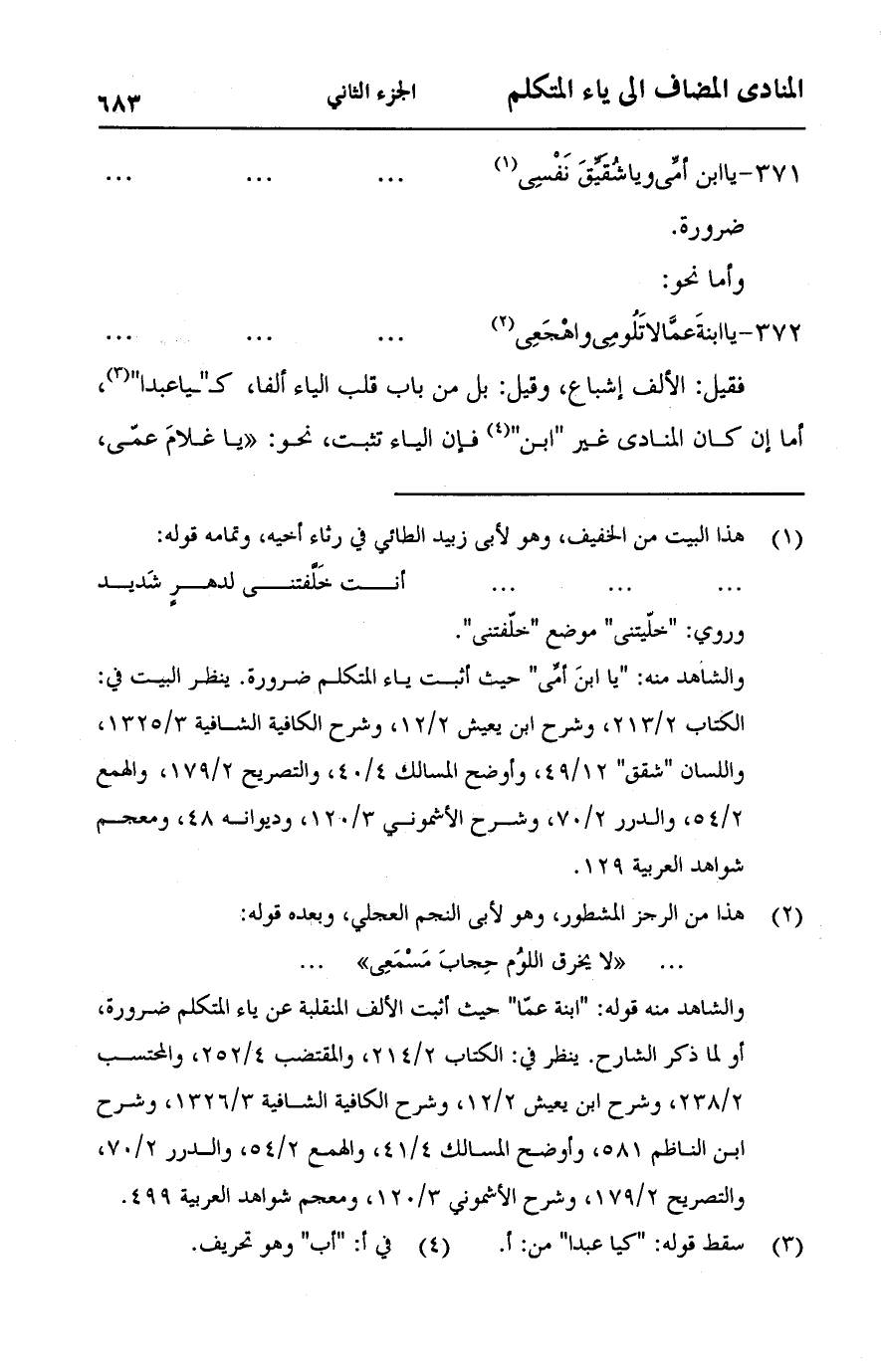 فقيل: الألف إشباع، وقيل: بل من باب قلب الياء ألف، "كيا عبداً"، أما إن كان المنادى غير"ابن" فإن الياء تثبت، نحو:" يا غلام عمي،