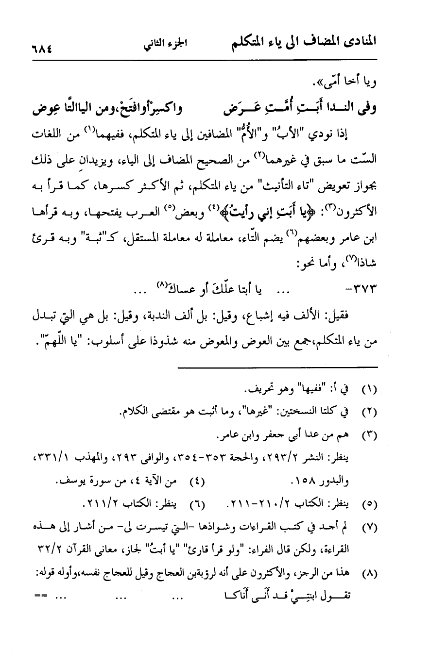 إذا نودي "الأب" و"الأم" المضافين إلى ياء المتكلم، ففيهما من اللغات الست ما سبق في غيرهما من الصحيح المضاف إلى الياء، ويزيدان على ذلك بجواز تعويض "تاء التأنيث" من ياء المتكلم، ثم الأكثر كسرها، كما قرأ به الأكثرون: {يَا أَبَتِ إِنِّي رَأَيْتُ} [سورة يوسف: 4] وبعض العرب يفتحها، وبه قرأها ابن عامر وبعضهم يضم التاء، معاملة له معاملة المستقل، كـ "ثبة" وبه قرئ شاذا، وأما نحو: