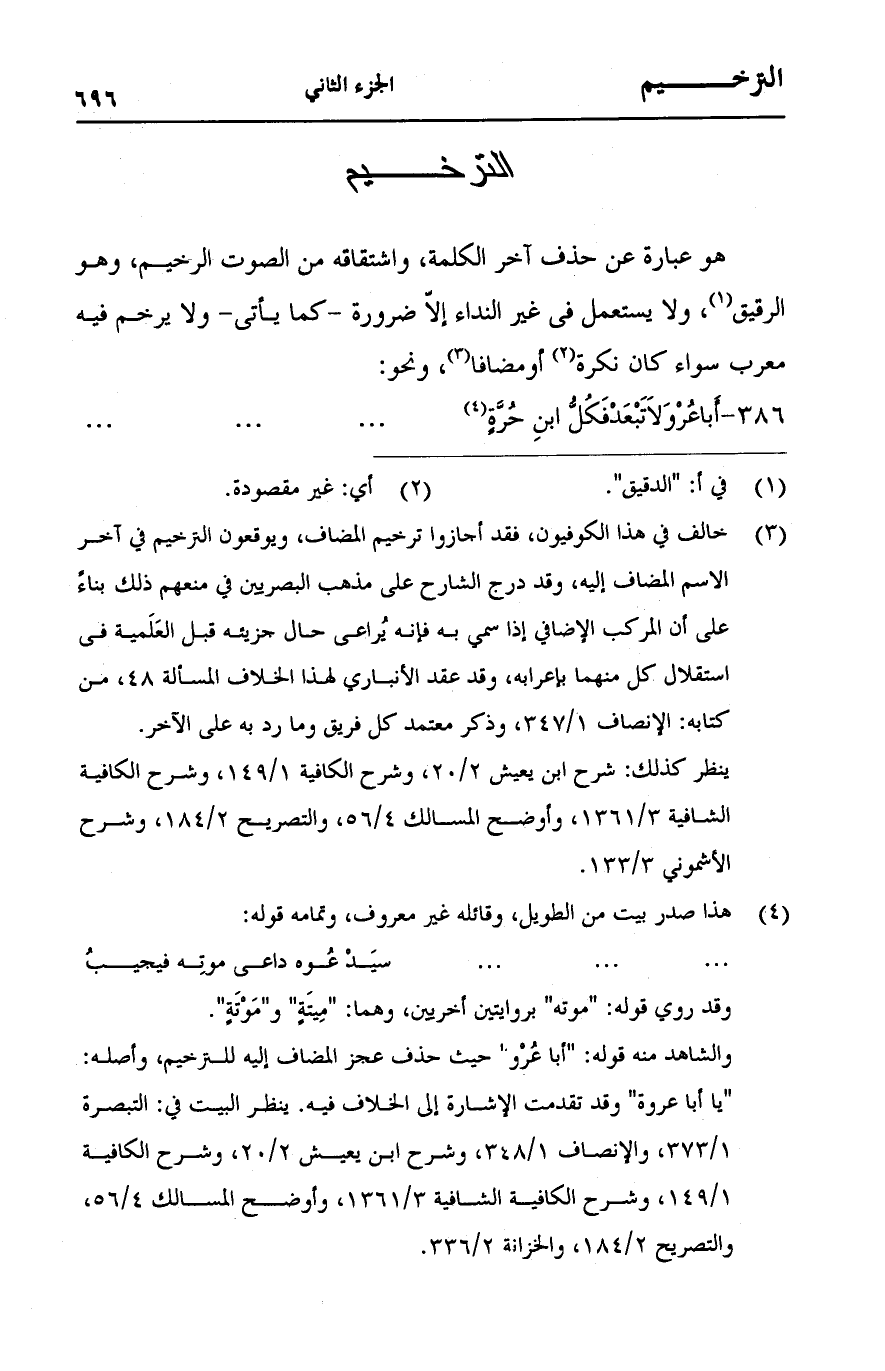 هو عبارة عن حذف آخر الكلمة، واشتقاقه من الصوت الرخيم، وهو الرقيق، ولا يستعمل في غير النداء إلا ضرورة-كما يأتي- ولا يرخم فيه معرب سواء كان نكرة أو مضافا، ونحو: