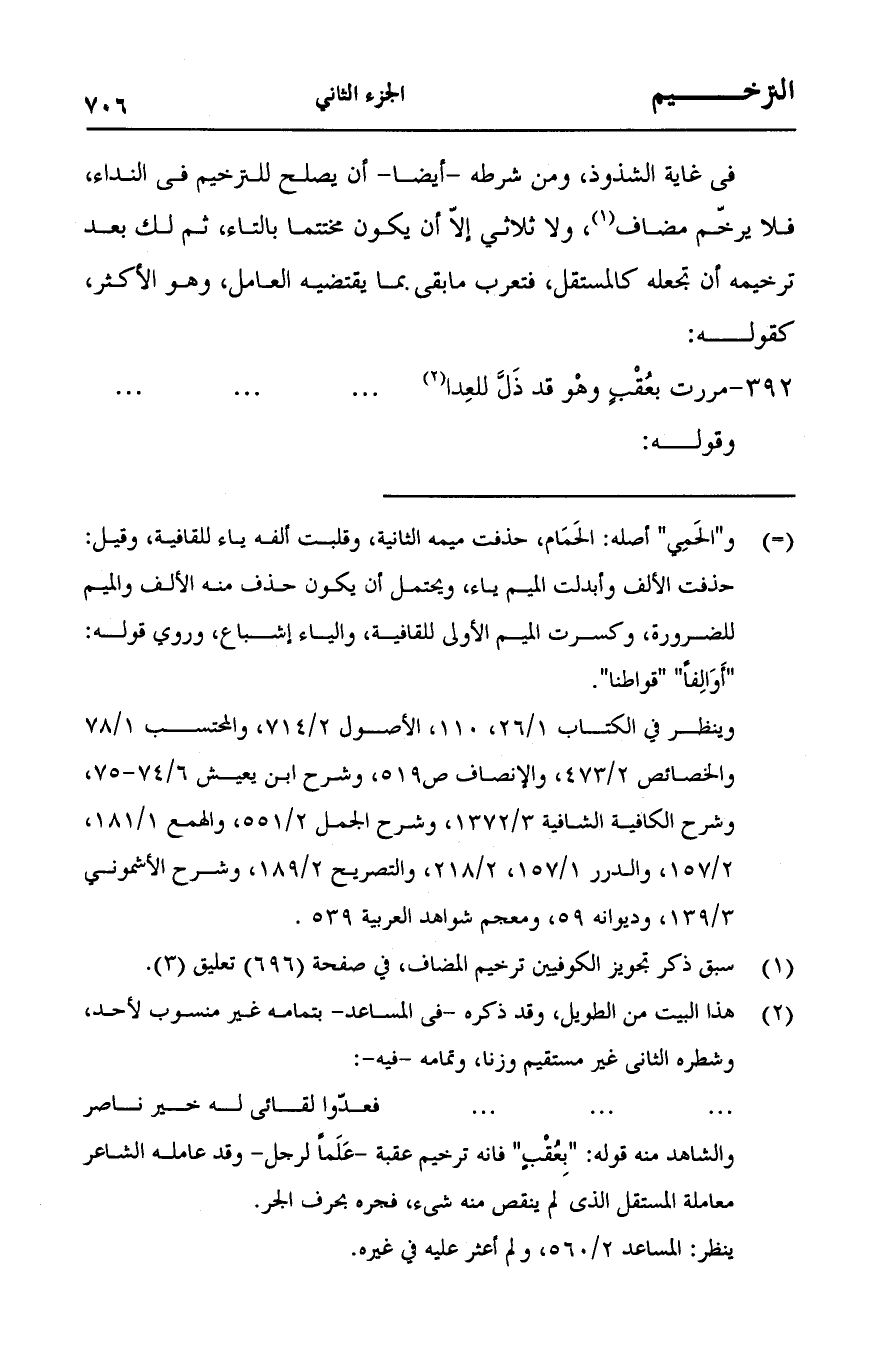 في غاية الشذوذ، ومن شرطه - أيضاً - أن يصلح للترخيم في النداء، فلا يرخم مضاف، ولا ثلاثي إلا أن يكون ختتما بالتاء، ثم لك بعد ترخيمه أن تجعله كالمستقل، فتعرب ما بقي بما يقتضيه العامل، وهو الأكثر كقوله: