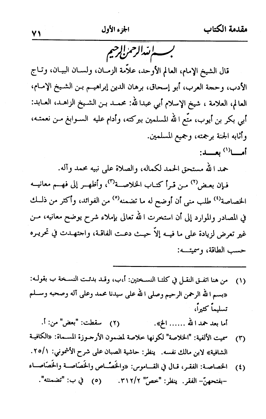 فإن بعض من قرأ كتاب الخلاصة، وأظهر إلى فهم معانيه الخصاصة طلب مني أن أوضح له ما تضمنه من الفوائد، وأكثر من ذلك في المصادر والموارده إلى أن استخرت الله تعالى بإملاء شرح يوضح معانيه، من تعرض لزيادة على ما فيه إلا حيث دعت الفاقة، واجتهدت في تحريره حسب الطاقة، وسميته: