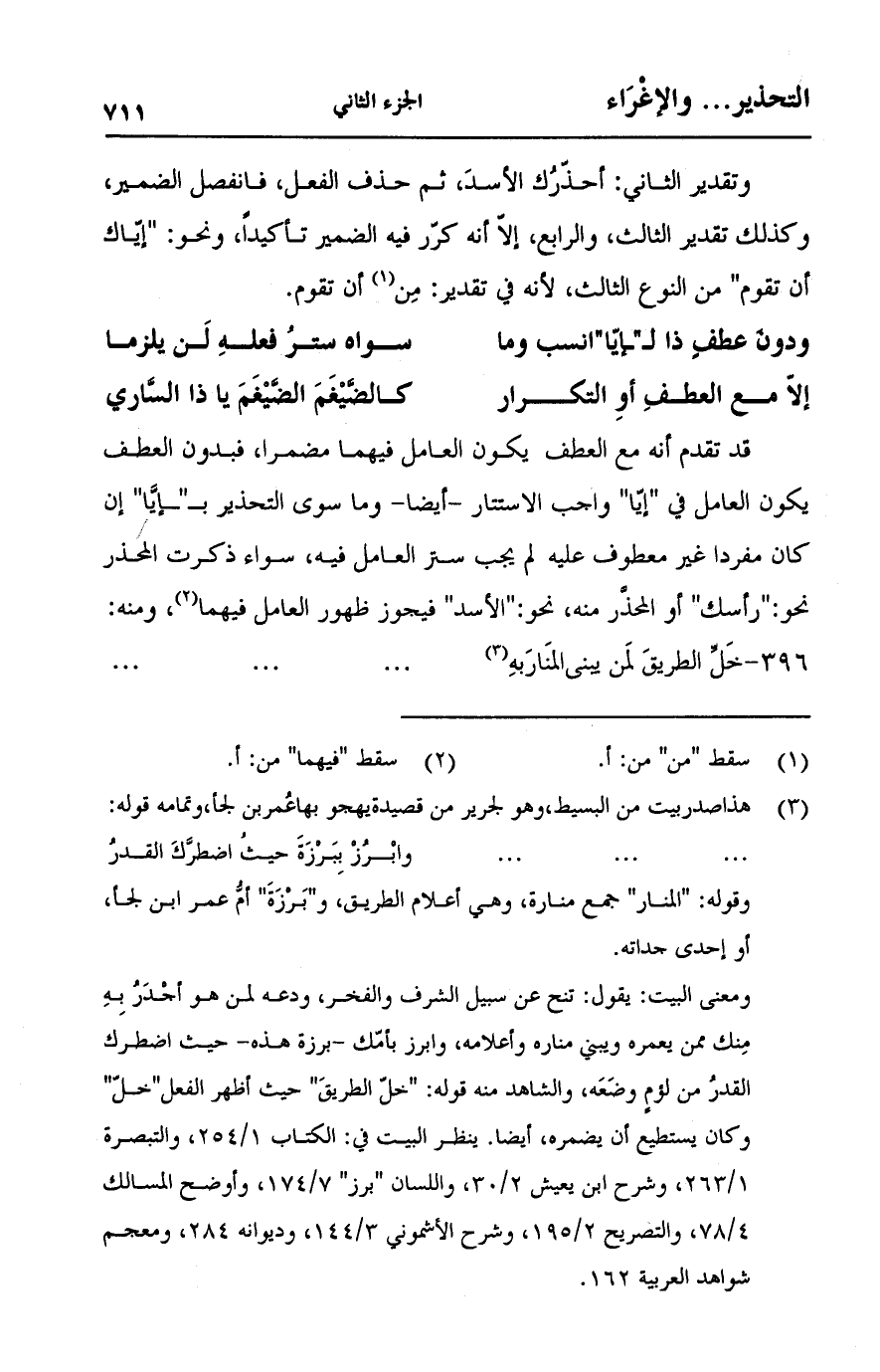 وتقدير الثاني: أحذرك الأسد، ثم حذف الفعل، فانفصل الضمير، وكذلك تقدير الثالث، والرابع، إلا أنه كرر فيه الضمير تأكيداً، ونحو: "إياك أن تقوم" من النوع الثالث، لأنه في تقدير: من أن تقوم.
