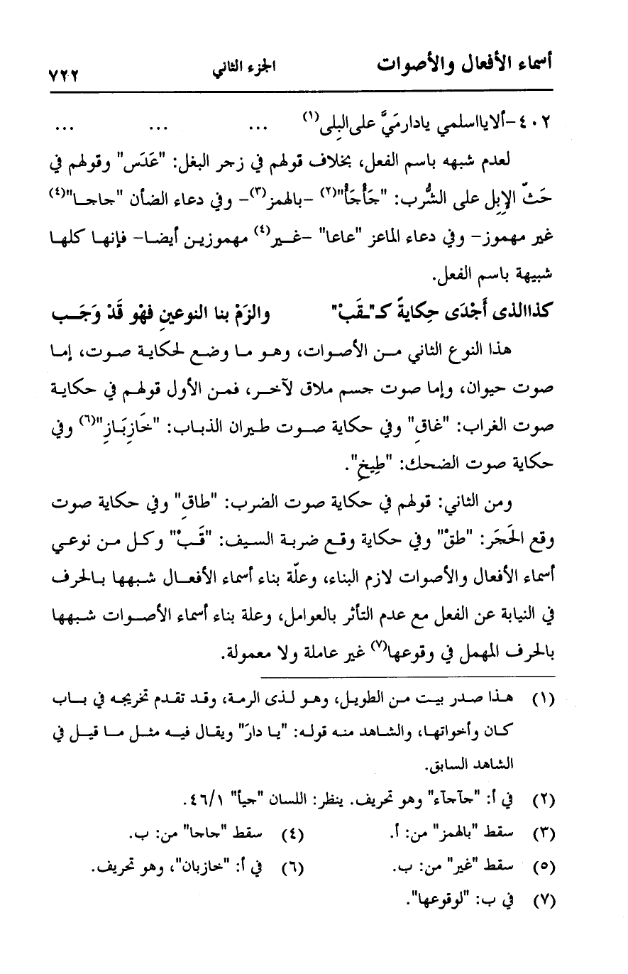 ومن الثاني: قولهم في حكاية صوت الضرب: "طاق" وفي حكاية صوت وقع الحجر: "طق" وفي حكاية وقع ضربة السيف" "قب" وكل من نوعي أسماء الأفعال شبهها بالحرف في النيابة عن الفعل مع عدم التأثر بالعوامل، وعلة بناء أسماء الأصوات شبهها بالحرف المهمل في وقوعها غير عاملة ولا معمولة.