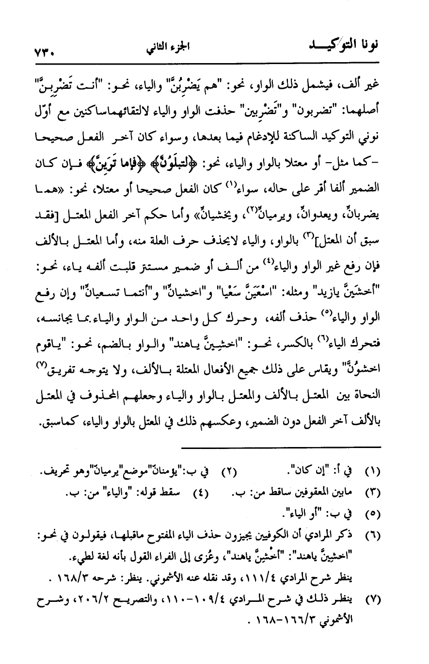 غير ألف، فيشمل ذلك الواو، نحو: "هم يضربن" والياء، نحو: "أنت تضربن" أصلهما: "تضربون" و "تضربين" حذفت الواو والياء لالتقاءهما ساكنين مع أول نوني التوكيد الساكنة للإدغام فيما بعدها، وسواء كان آخر الفعل صحيحاً -كما مثل- أو معتلا بالواو والياء، نحو: {لَتُبْلَوُنَّ} {فَإِمَّا تَرَيْنَ} فإن كان الضمير ألفا أقر على حاله، سواء كان الفعل صحيحاً أو معتلاً، نحو: "هما يضربان، ويعدوان، ويرميان، ويخشيان" وأما حكم آخر الفعل المعتل [فقد سبق أن المعتل] بالواو، والياء لا يحذف حرف العلة منه، وأما المعتل بالألف فإن رفع غير الواو والياء من ألف أو ضمير مستتر قلبت ألفه ياء، نحو: "أحشين يا زيد" ومثله: "اسعين سعيا" و "اخشيان" و "أنتما تسعيان" وإن رفع الواو والياء حذف ألفه، وحرك كل واحد من الواو والياء بما يجانسه، فتحرك الياء بالكسر، نحو: "احشين يا هند" والواو بالضم، نحو: "يا قوم اخشون" ويقاس على ذلك جميع الأفعال المعتلة بالألف، ولا يتوجه تفريق النجاة بين المعتل بالألف والمعتل بالواو والياء وجعلهم المحذوف في المعتل بالألف آخر الفعل دون الضمير، وعكسهم ذلك في المعتل بالواو والياء، كما سبق.