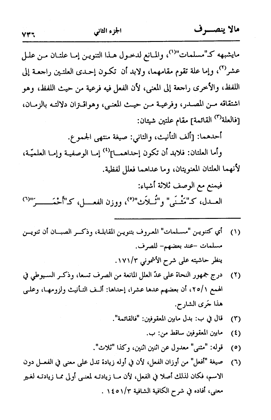 ما يشبهه كـ "مسلمات"، والمانع لدخول هذا التنوين إما علتان من علل عشر، وإما علة تقوم مقامهما، ولابد أن تكون إحدى العلتين راجعة إلى اللفظ، والأخرى راجعة إلى المعنى لأن الفعل فيه فرعية من حيث اللفظ، وهو اشتقاقه من المصدر، وفرعية من حيث المعنى، وهو اقتران دلالته بالزمان، [فالعلة القائمة] مقام علتين شيئان:
