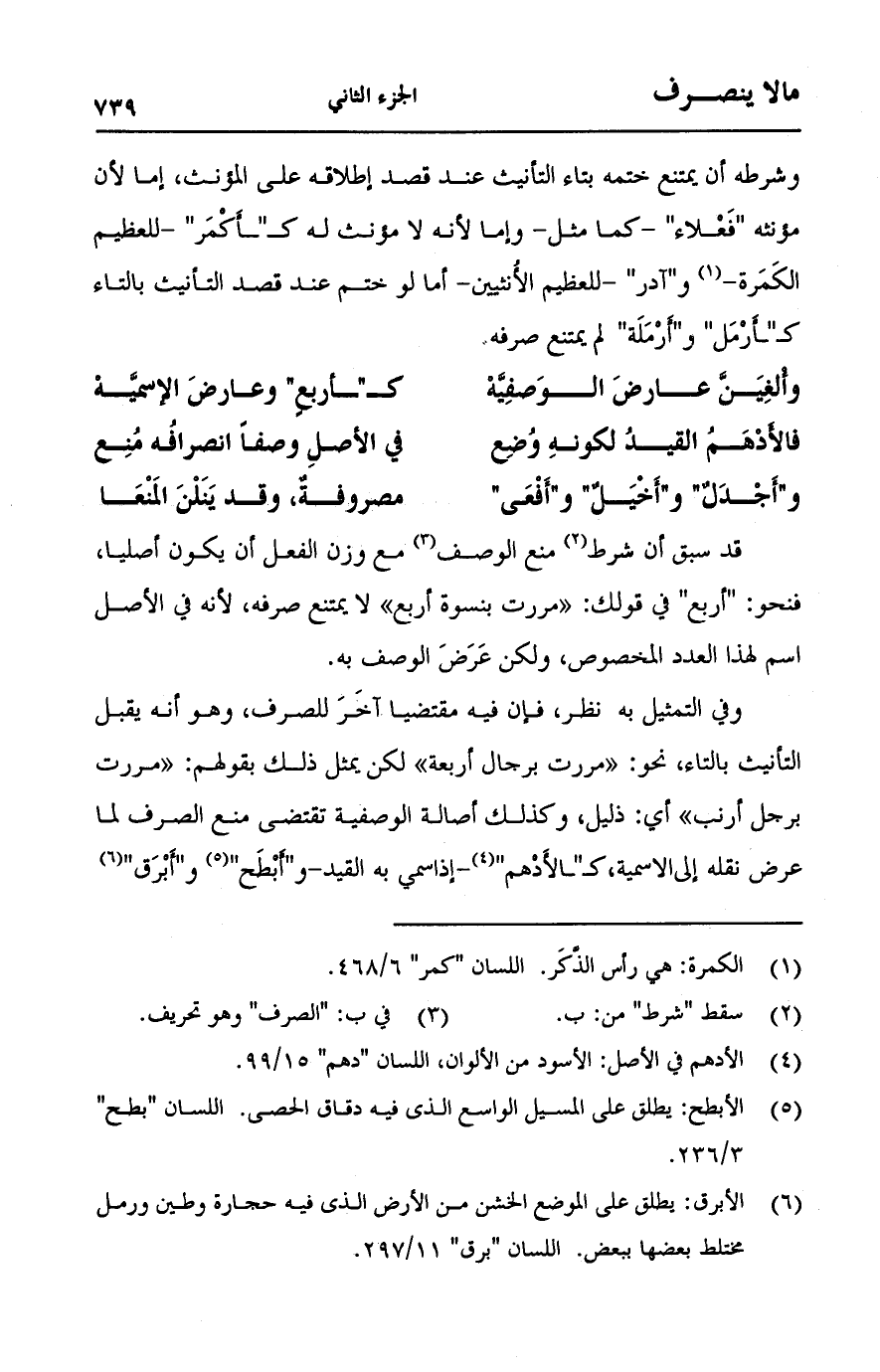وشرطه أن يمتنع ختمه بتاء التأنيث عند قصد إطلاقه على المؤنث، إما لأن مؤنثه "فعلاء" - كما مثل- وإما لأنه لا مؤنث له كـ "أمر" - للعظيم الكمرة- و "آدر" - للعظيم الأنثيين - أما لو ختم عند قصد التأنيث بالتاء كـ "أرمل" و "أرملة" لم يمتنع صرفه.