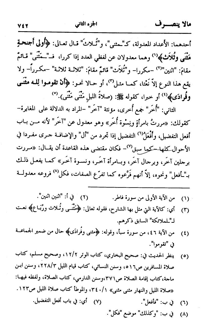 أحدهما: الأعداد المعدولة، كـ "مثنى"، و "ثلاث" قال تعالى: {أُولِي أَجْنِحَةٍ مَثْنَى وَثُلاثَ} [فاطر:1] وهما معدولان عن لفظي العدد إذا كررا، فـ "مثنى" قائمٌ مقام: "اثنين" - مكررا- و "ثلاث" قائم مقام: "ثلاثة ثلاثة" - مكررا- ولا يقع هذا النوع إلا نعتا، كما مثل أو حالا نحو: {أَنْ تَقُومُوا لِلَّهِ مَثْنَى وَفُرَادَى} [سبأ:46] أو خبرا، كقوله - صلى الله عليه وسلم-: (صلاة الليل مثنى مثنى).