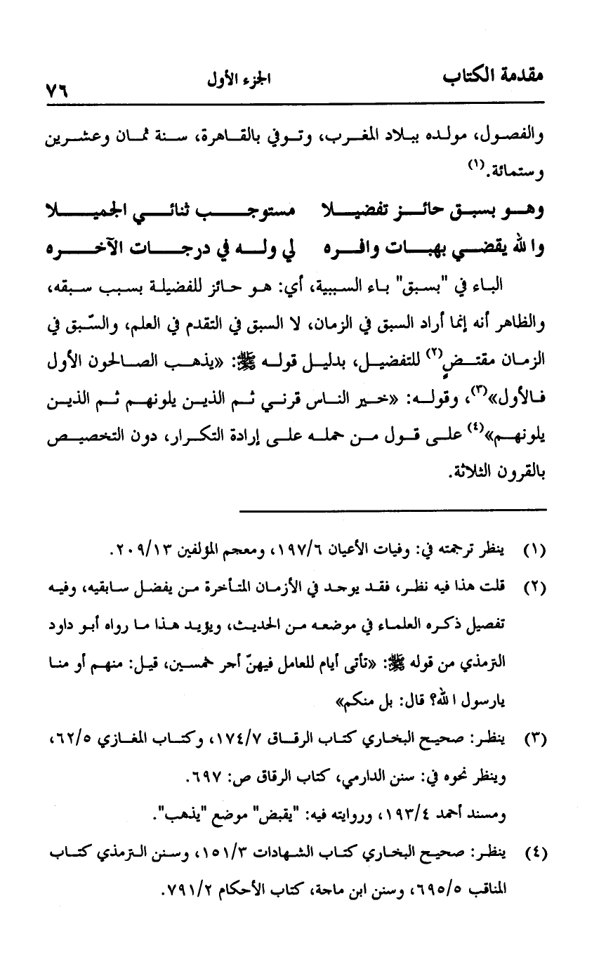 الباء في "بسبق" باء السببية، أي: هو حائز للفضيلة بسبب سبقه، والظاهر أنه إنما أراد السبق في الزمان، لا السبق في التقدم في العلم، والسّبق في الزمان مقتضٍ للتفضيل، بدليل قوله صلَّ الله عليه وسلم: "يذهب الصالحون الأول فالأول"، وقوله: "خير الناس قرني ثم الذين يلونهم ثم الذين يلونهم" على قول من حمله على إرادة التكرار، دون التخصيص بالقرون الثلاثة.