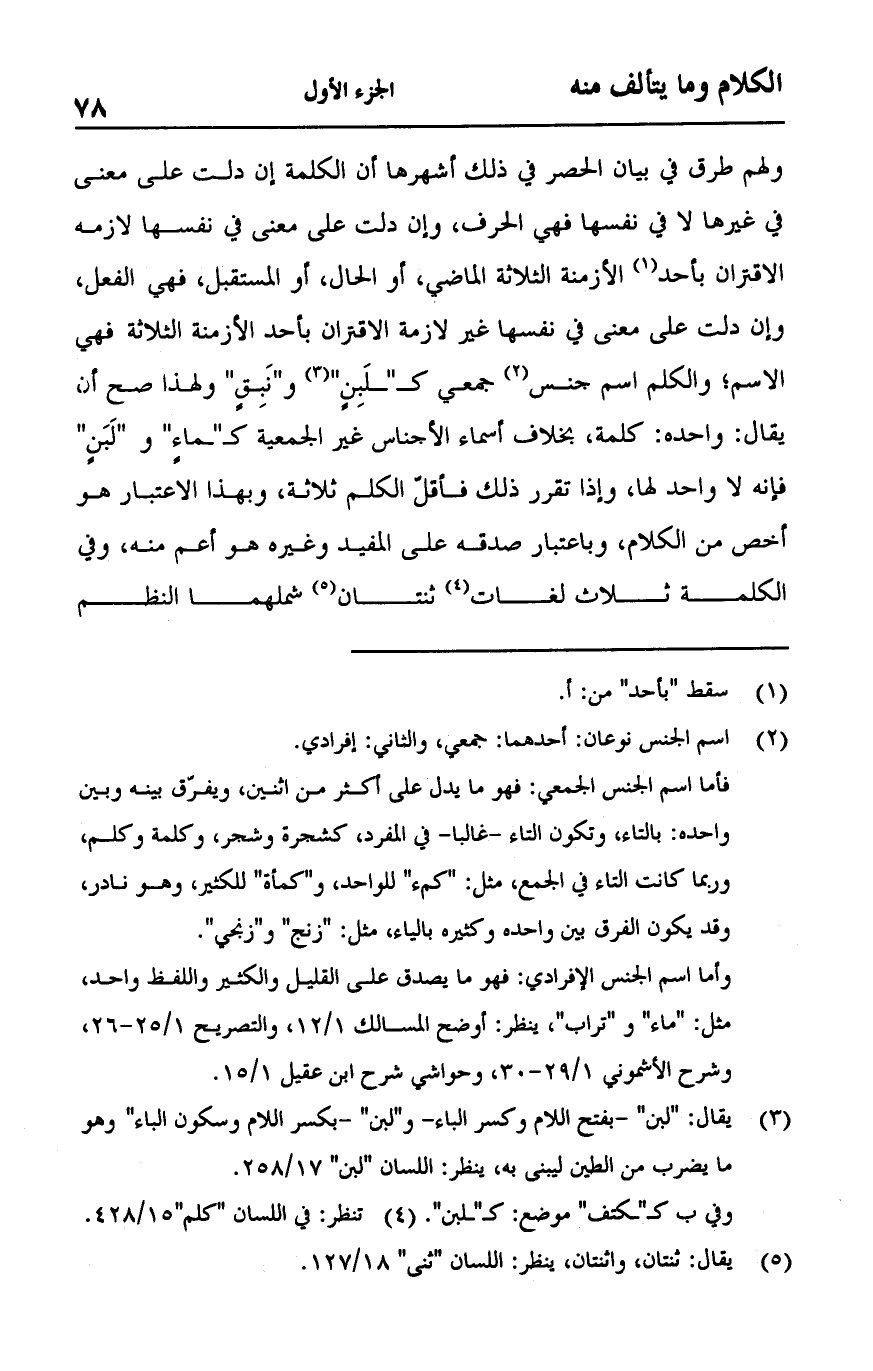 ولهم طرق في بيان الحصر في ذلك أشهرها أن الكلمة إن دلت على معنى في غيرها لا في نفسها فهي الحرف، وإن دلت على كلمة في نفسها لازمه الاقتران بأحد الأزمنة الثلاثة الماضي، أو الحال، أو المستقبل، فهي الفعل، وإن دلت على معنى في نفسها غير لازمة الاقتران بأحد الأزمنة الثلاثة فهي الاسم؛ والكلم اسم جنس جمعي كـ"لَبِنٍ" و "نَبِقٍ" ولهذا صح أن يقال: واحده: كلمة، بخلاف أسماء الأجناس غير الجمعية كـ"ماءٍ" و "لَبَنٍ" فإنه لا واحد لها، وإذا تقرر ذلك فأقلّ الكلم ثلاثة، وبهذا الاعتبار هو أخص من الكلام، وباعتبار صدقه على المفيد وغيره هو أعم منه، وفي الكلمة ثلاث لغات ثنتان شملهما النظم