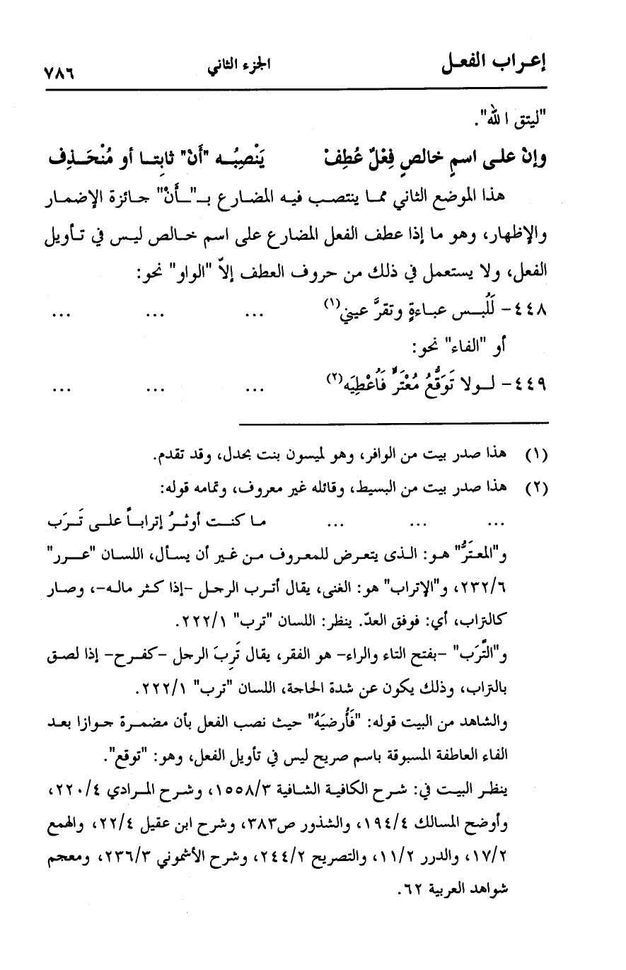 والإظهار, وهو ما إذا عطف الفعل المضارع على اسم خالص ليس في تأويل