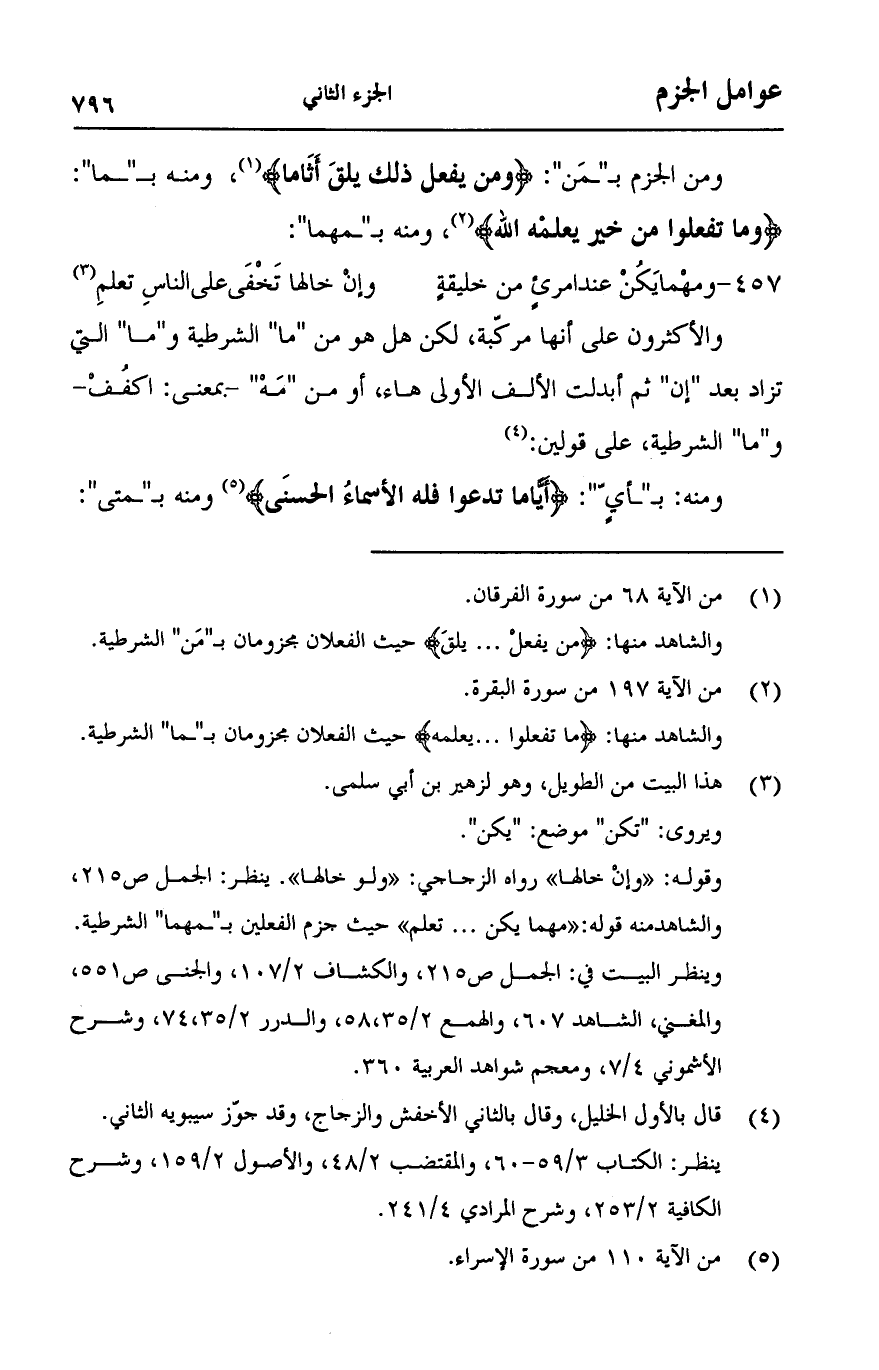 ومن الجزم بـ"ـمن": {وَمَنْ يَفْعَلْ ذَلِكَ يَلْقَ أَثَامًا} , ومنه بـ"ـما":